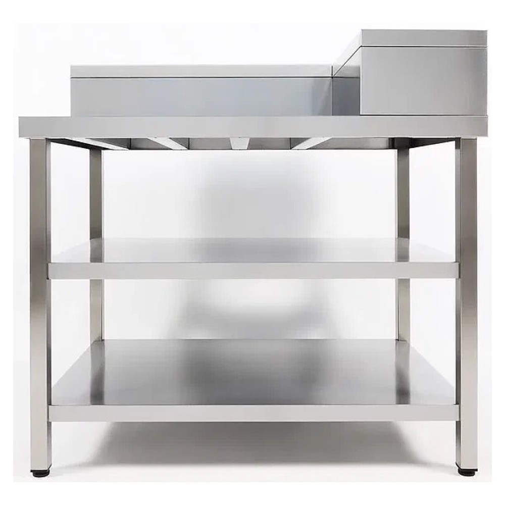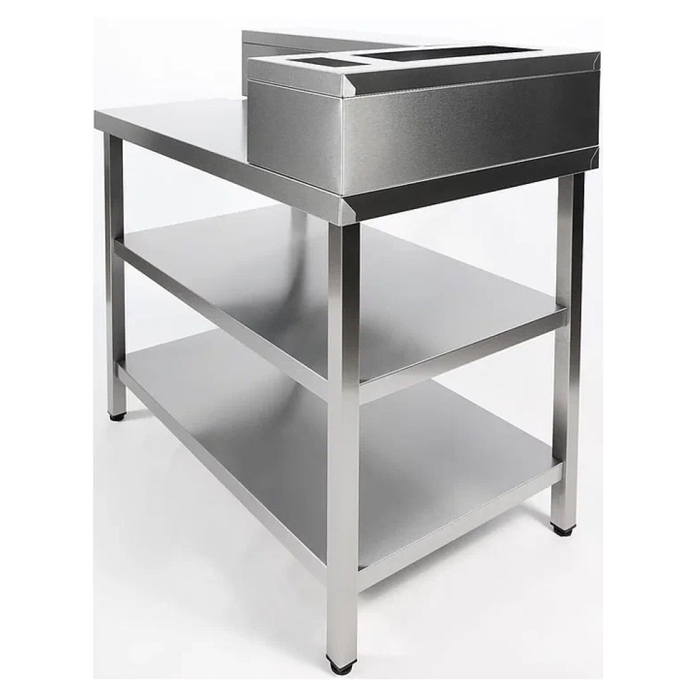 Блинная станция Restoinox БСФ-110/7П используется на предприятиях общественного питания и торговли для комплексного оснащения рабочего места приготовления и раздачи блинов с начинкой. Модель оснащена 2 полками, нишей под блинный аппарат, гнездами под емкости для масла и теста и регулируемыми по высоте опорами. Каркас и столешница выполнены из нержавеющей стали AISI 430, ножки - из квадратной трубы 40х40 мм нержавеющей стали AISI 430.