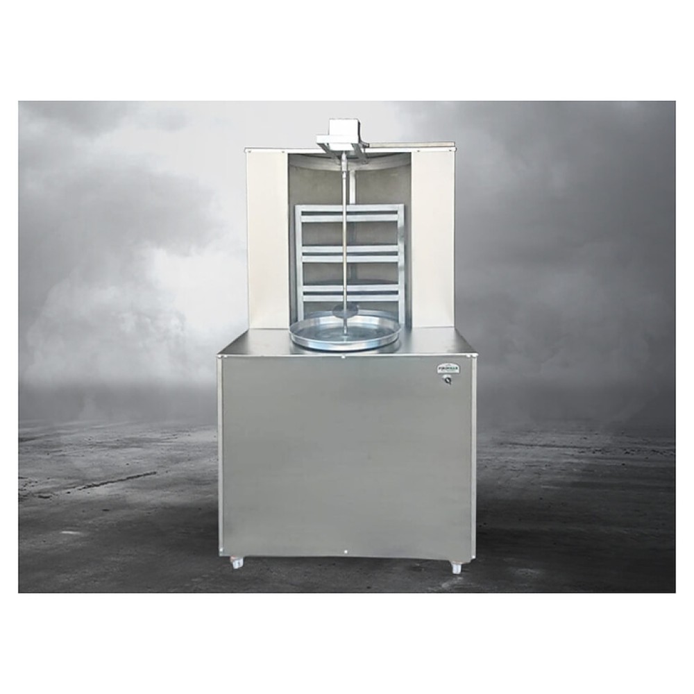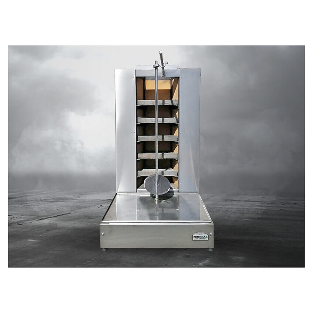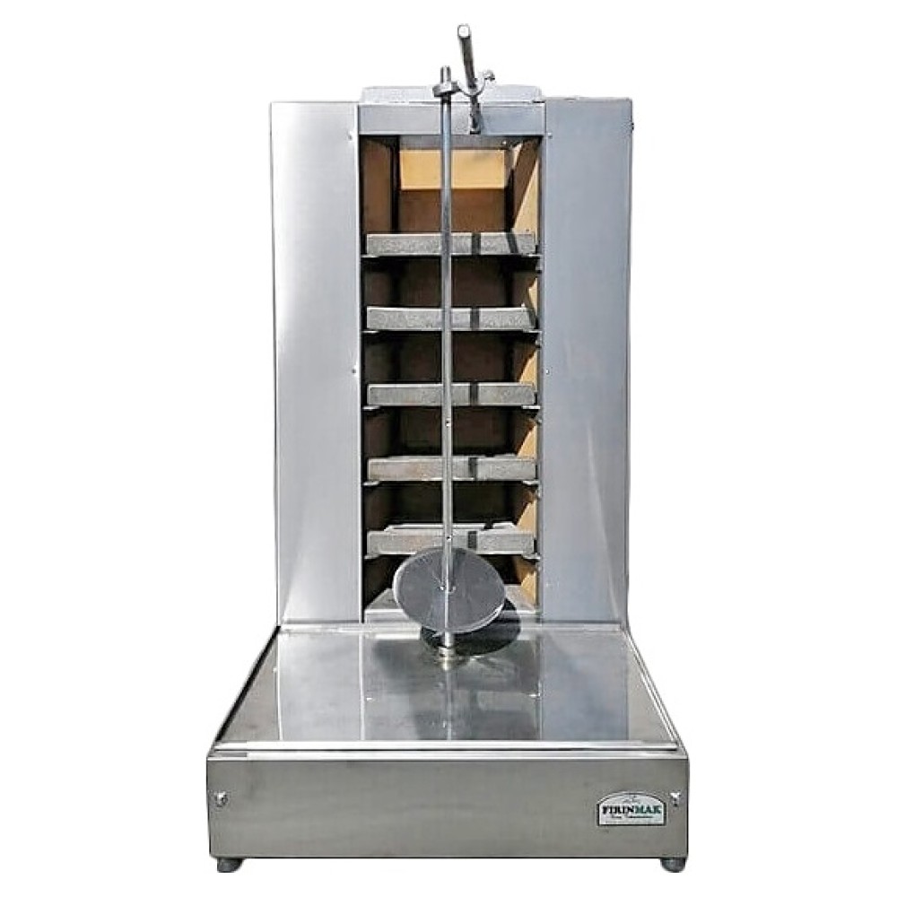 Газовый ротационный гриль для шаурмы Firinmak используется на предприятиях общественного питания и торговли для приготовления мясной начинки для шаурмы. Равномерное приготовление мяса происходит благодаря вращению заготовки вокруг своей оси около нагревательных элементов, по мере готовности прожаренный слой срезается электрическим или механическим ножом. Модель оснащена вертикально ориентированным жарочным блоком с несколькими зонами нагрева с газовыми нагревательными элементами и электромеханическим управлением. Корпус выполнен из нержавеющей стали, жарочный блок – из огнеупорного кирпича.