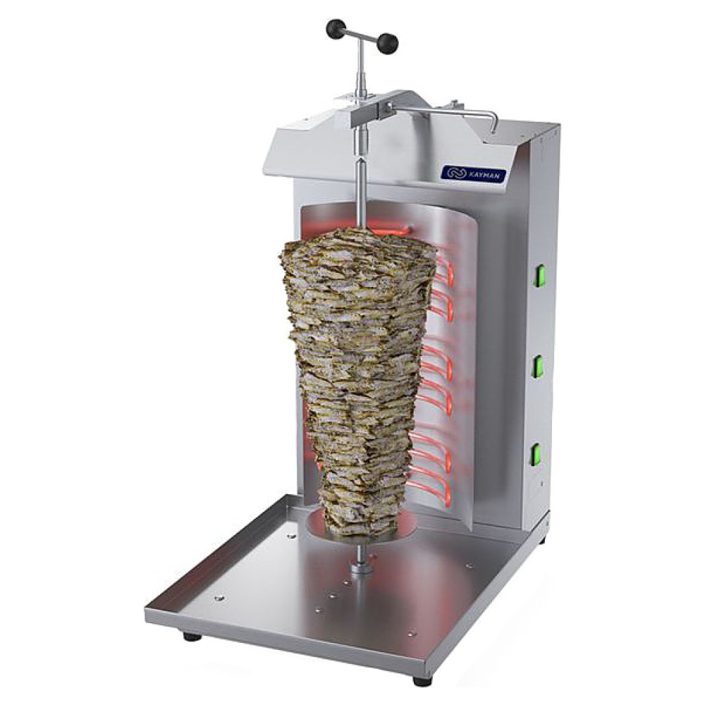 Электрический гриль KAYMAN ШЭ-ОЦ-3-РП А используется на предприятиях общественного питания и торговли для приготовления мясной начинки популярного блюда шаурма (шаверма). Модель оснащена 3 изогнутыми ТЭНами, отражателями тепла и защитным козырьком, препятствующим обжиганию рук и перегреву электропривода. Корпус выполнен из нержавеющей стали, все элементы, контактирующие с пищей - из материалов, разрешенных для контакта из оцинкованной стали.