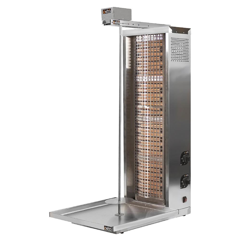 Гриль для шаурмы Osba 3.4KT предназначен для обжарки большого количества различных видов мяса и птицы для приготовления начинки для шаурмы, донера и других блюд на предприятиях общественного питания и торговли. Модель оснащена 4 нагревательными элементами и защитной сеткой. Корпус выполнен из нержавеющей стали AISI 304.