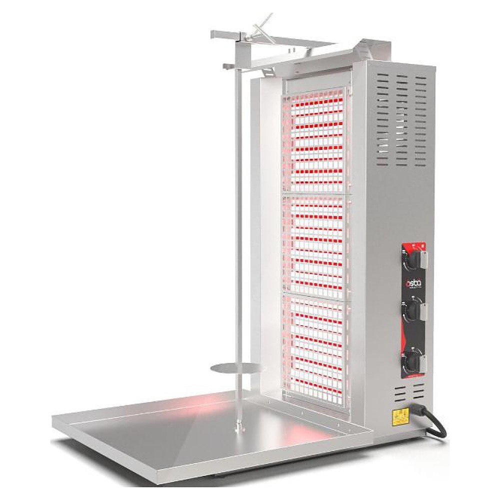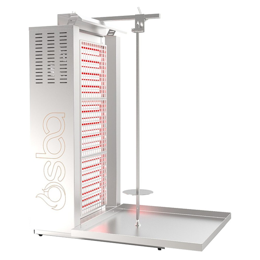Электрический гриль Osba SH3-L предназначен для обжарки большого количества различных видов мяса и птицы при приготовлении начинки для шаурмы, донера и других блюд на предприятиях общественного питания и торговли. Размещение на вертикальном вертеле и ручное управление вращением обеспечивают равномерное приготовление. Модель оснащена защитным козырьком и 3 зонами нагрева, каждая из которых имеет индивидуальное управление с плавной регулировкой мощности. Перемещение вертела вперед и назад позволяет регулировать расстояние между мясом и нагревом при разном количестве заготовки. Корпус и решетки нагревательных элементов выполнены из нержавеющей стали, которая отличается прочностью и долговечностью.