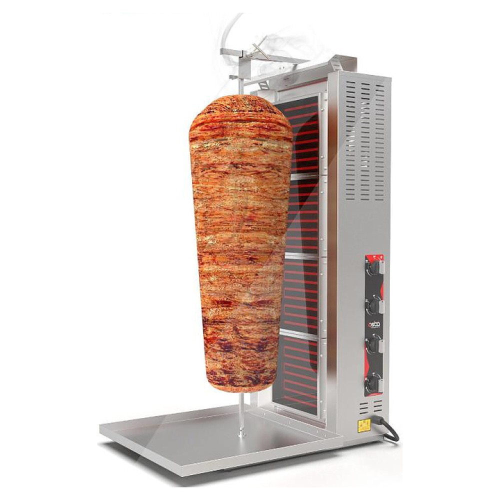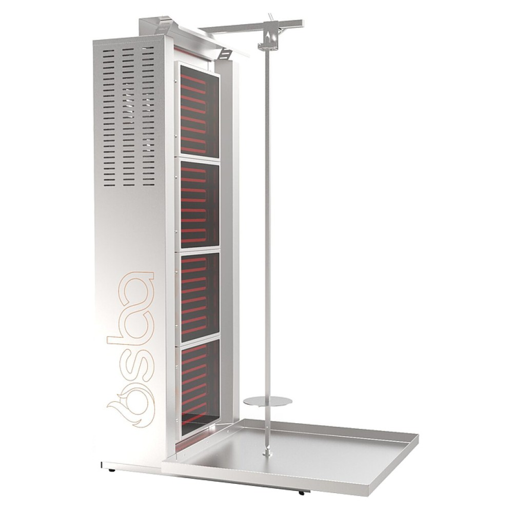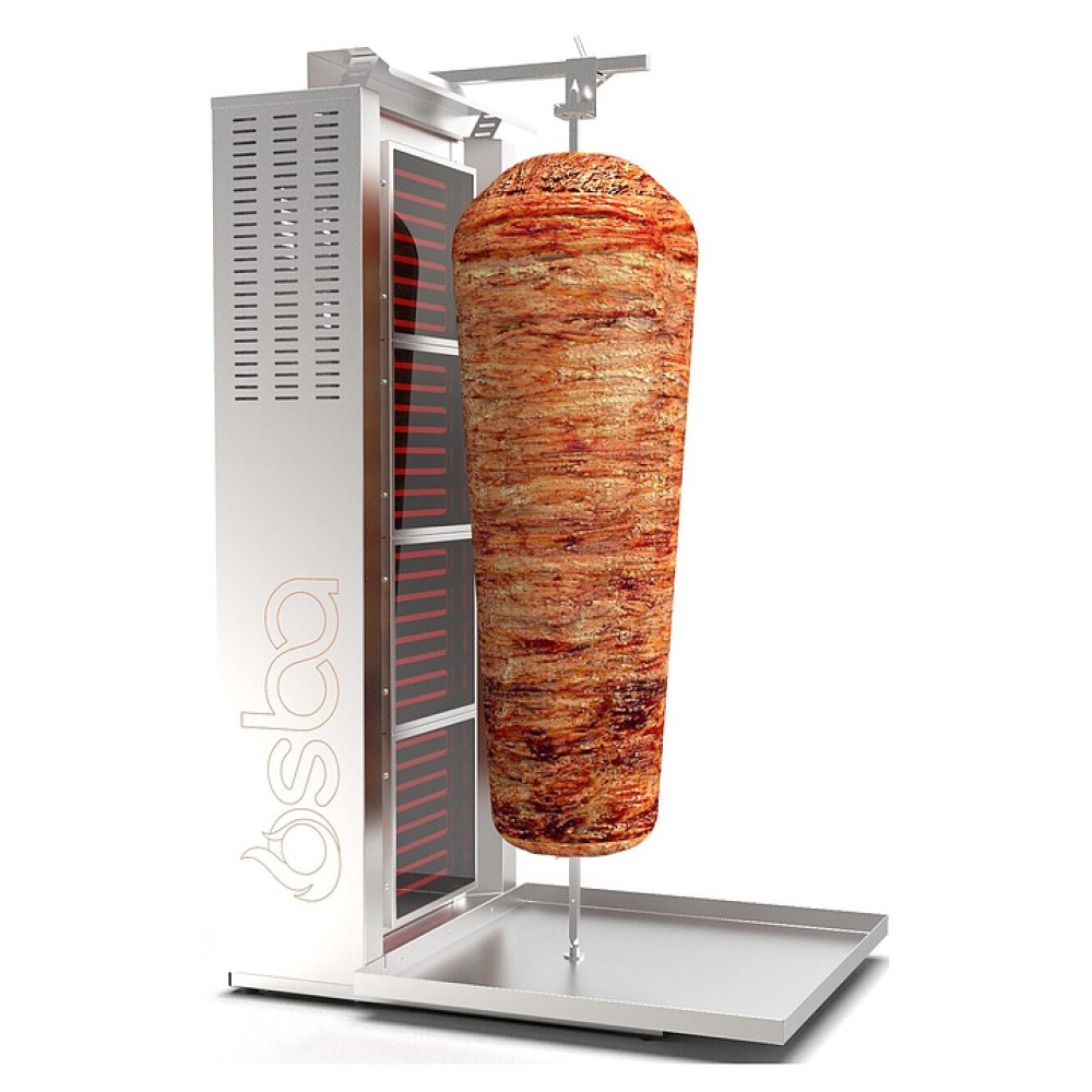Электрический гриль Osba SH4-C предназначен для обжарки большого количества различных видов мяса и птицы при приготовлении начинки для шаурмы, донера и других блюд на предприятиях общественного питания и торговли. Размещение на вертикальном вертеле и ручное управление вращением обеспечивают равномерное приготовление. Модель оснащена защитным козырьком и 4 зонами нагрева, каждая из которых имеет индивидуальное управление с плавной регулировкой мощности. Покрытие на нагревательных элементах гарантирует легкую очистку. Перемещение вертела вперед и назад позволяет регулировать расстояние между мясом и нагревом при разном количестве заготовки. Корпус выполнен из пищевой нержавеющей стали, которая отличается прочностью и долговечностью, защита нагревателей - из жаростойкой стеклокерамики.