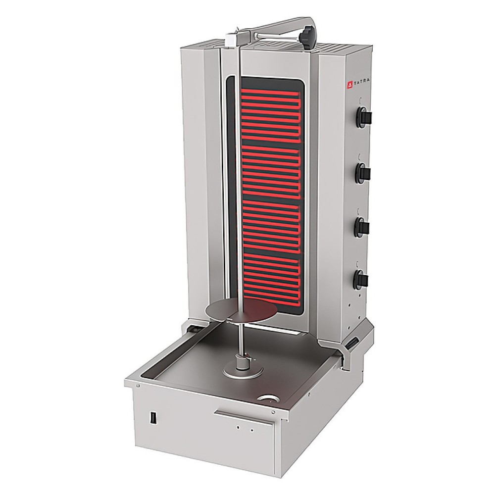 Гриль для шаурмы Tatra TDM E 4BW предназначен для обжарки большого количества различных видов мяса и птицы при приготовлении начинки из рубленного мяса для шаурмы и других блюд на предприятиях общественного питания и торговли. Модель оснащена электромеханической панелью управления, нижним приводом вращения вертела и емкостью для сбора жира. Корпус выполнен из нержавеющей стали.