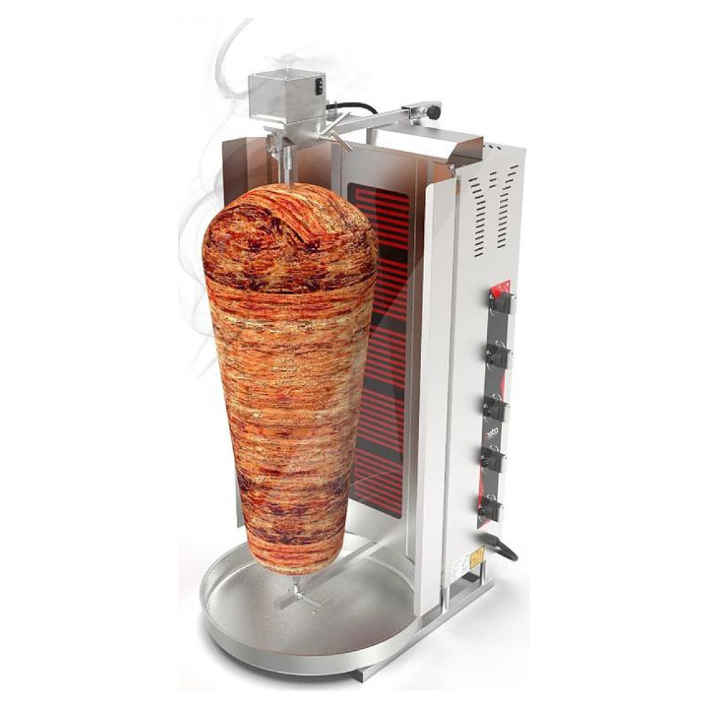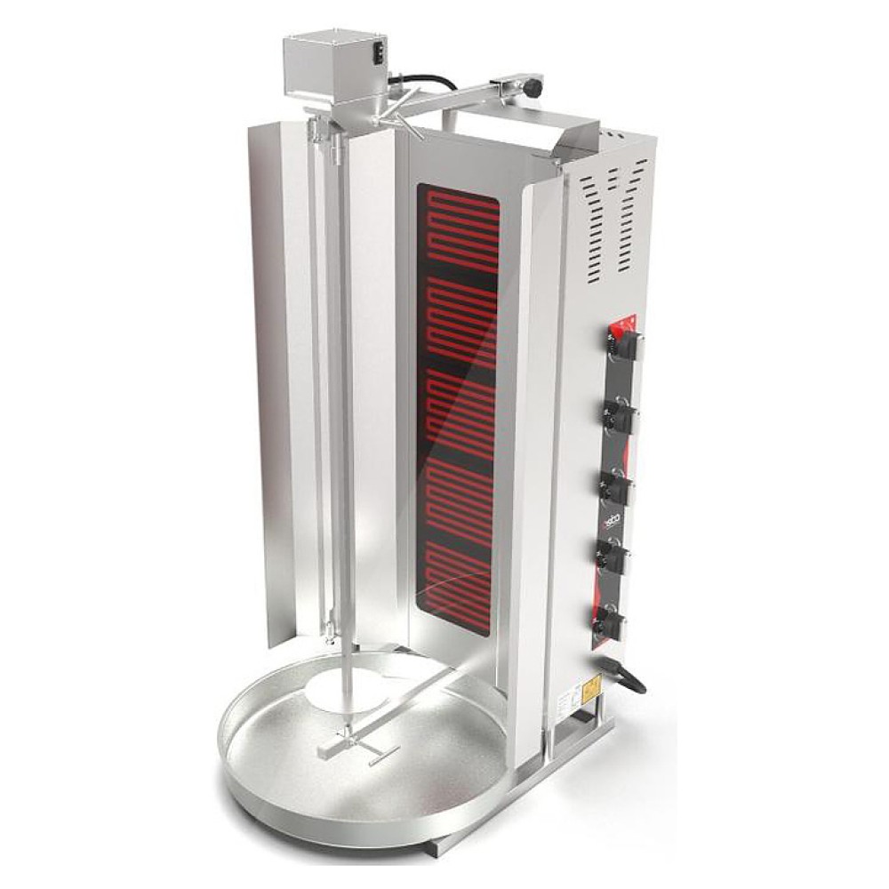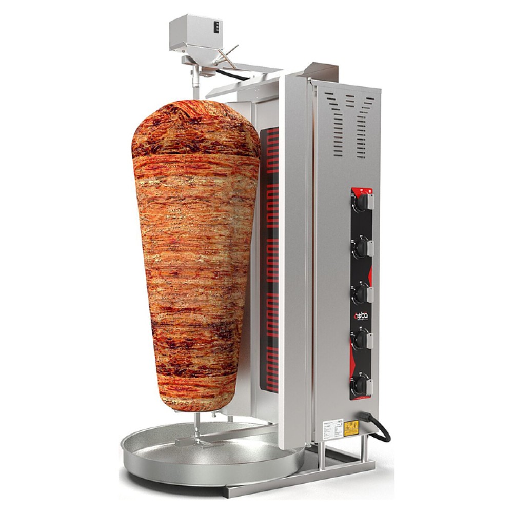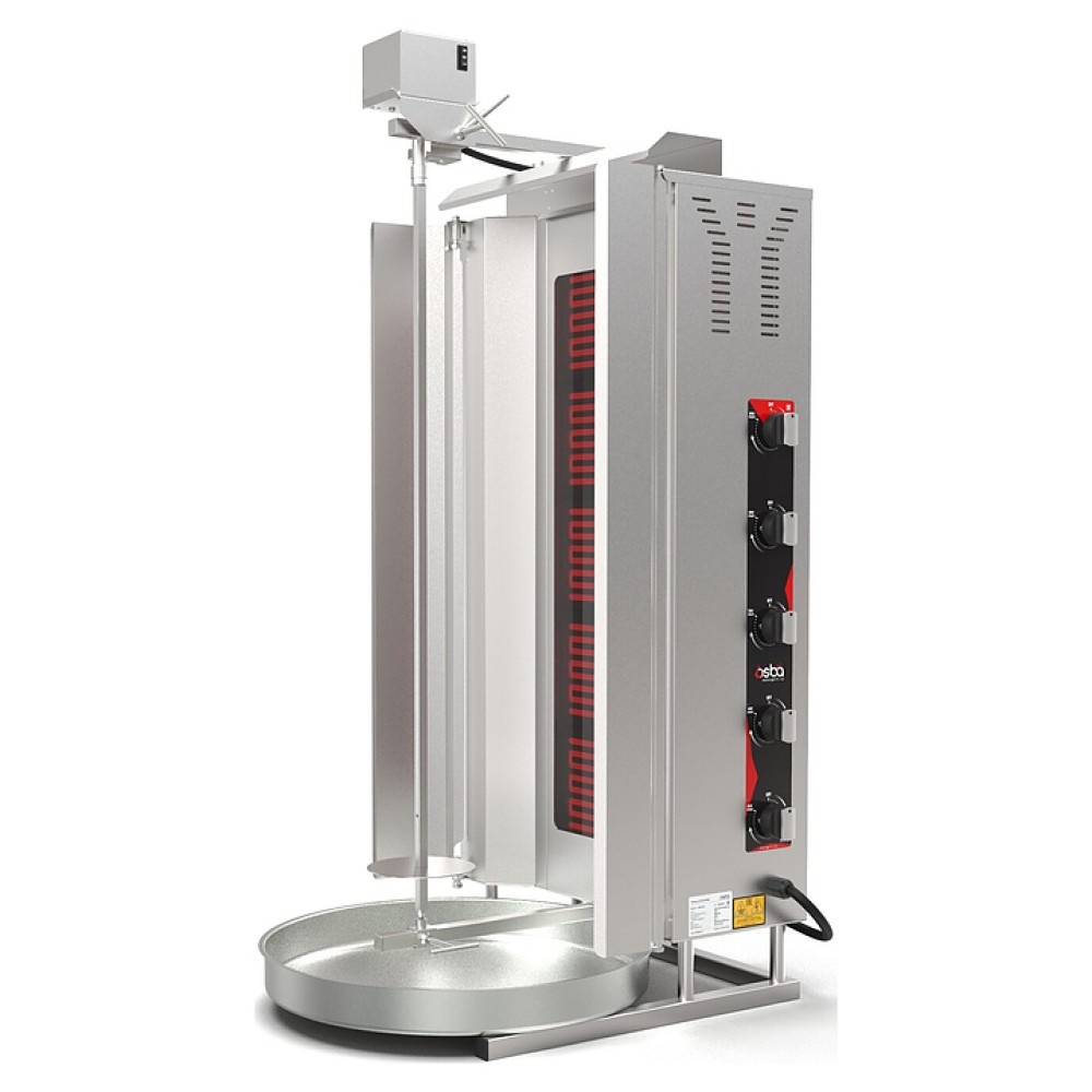 Электрический гриль Osba SD18 предназначен для обжарки большого количества различных видов мяса и птицы при приготовлении начинки для шаурмы, донера и других блюд на предприятиях общественного питания и торговли. Размещение на вертикальном вертеле и электрическое управление вращением обеспечивают равномерное приготовление. Модель оснащена защитным козырьком, 5 зонами нагрева, каждая из которых имеет индивидуальное управление с плавной регулировкой мощности. Покрытие на нагревательных элементах гарантирует легкую очистку. Перемещение вертела вперед и назад позволяет регулировать расстояние между мясом и нагревом при разном количестве заготовки. Корпус выполнен из нержавеющей стали, которая отличается прочностью и долговечностью, защита нагревателей - из жаростойкой стеклокерамики.