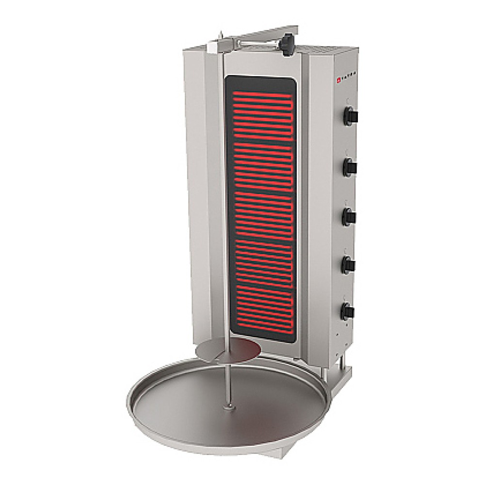 Гриль для шаурмы Tatra TDM E 5M предназначен для обжарки большого количества различных видов мяса и птицы при приготовлении начинки из рубленного мяса для шаурмы и других блюд на предприятиях общественного питания и торговли. Модель оснащена электромеханической панелью управления. Корпус выполнен из нержавеющей стали.