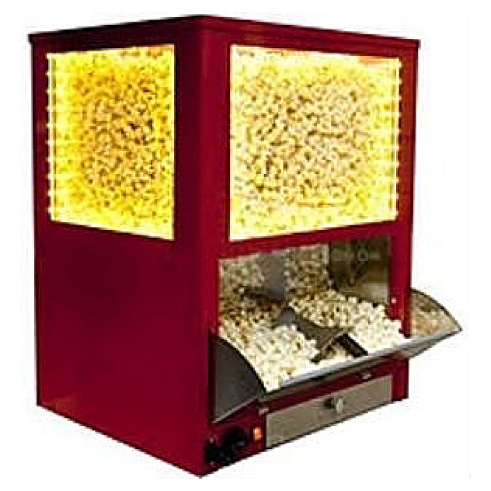 Витрина для попкорна с автоподачей RoboLabs VTP-060A действует по принципу автопоилки. Готовый попкорн засыпается сверху, заполняется весь внутренний объем витрины. Корпус окрашен в красный цвет. Витрина застелена со всех четырех сторон. Светодиодная подсветка внутри по периметру остекления. Может использоваться как пристенно, так и на передней линии обслуживания. Подогрев и конвекция внутреннего объема, попкорн греется только в нижней части. Таким образом, попкорн не пересыхает.