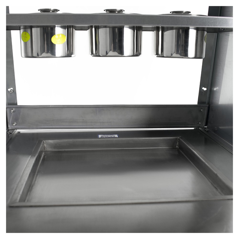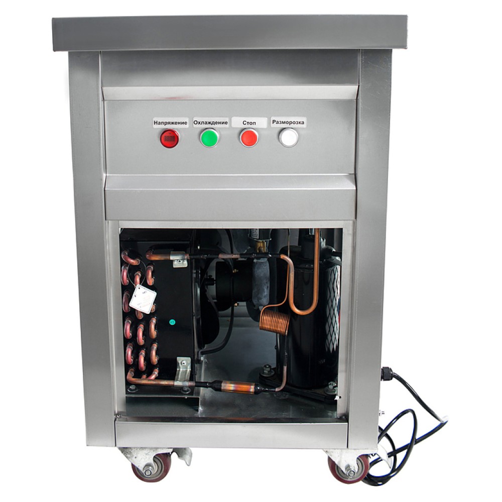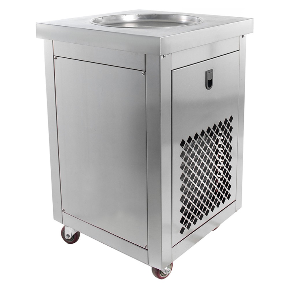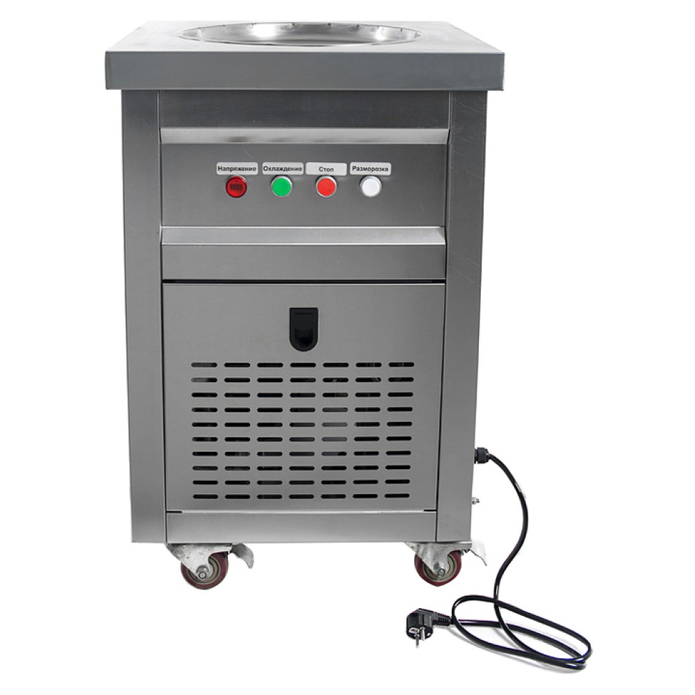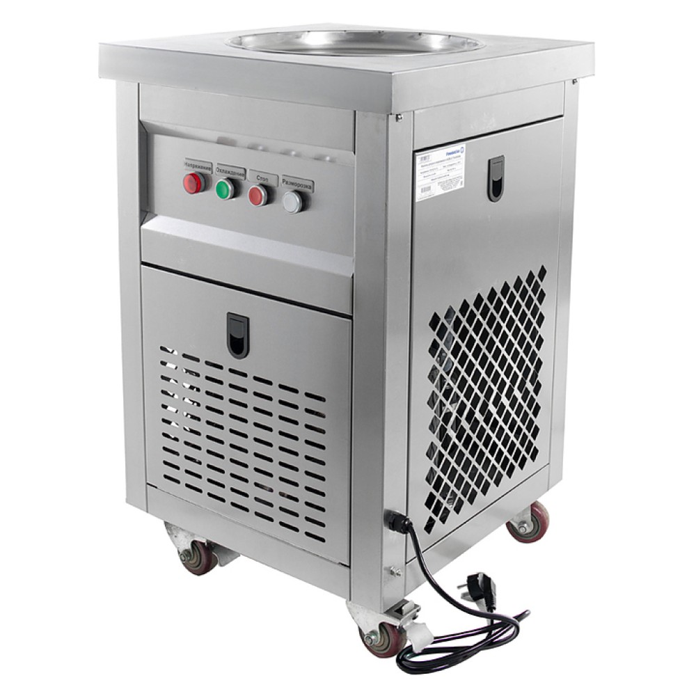 Фризер для мороженого Foodatlas KCB-1Y используется на предприятиях общественного питания и торговли для приготовления жареного мороженого в роллах. Модель оснащена механическим управлением, круглой охлаждаемой поверхностью для "жарки" десерта при минусовой температуре и 4 колесами, 2 из которых снабжены тормозом. Корпус выполнен из нержавеющей стали 430, сковорода - из нержавеющей стали 304, радиатор - из алюминия.