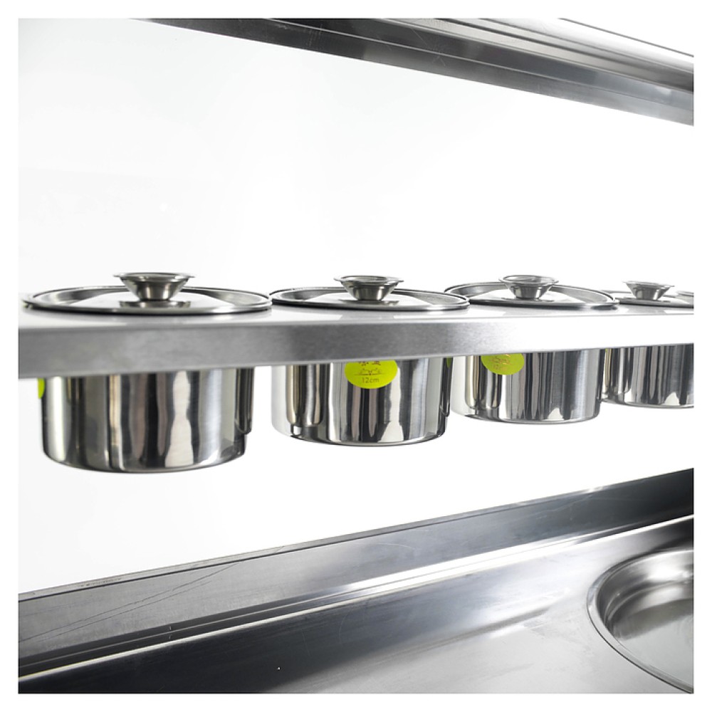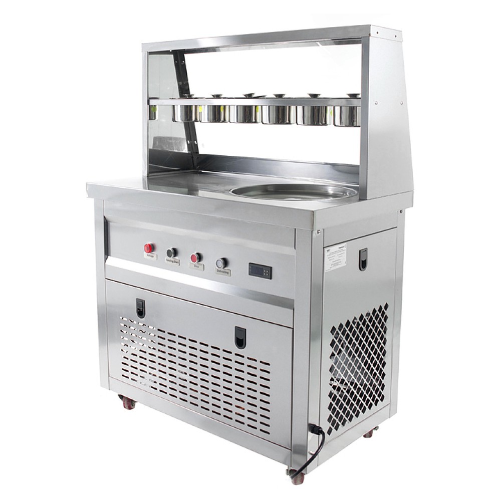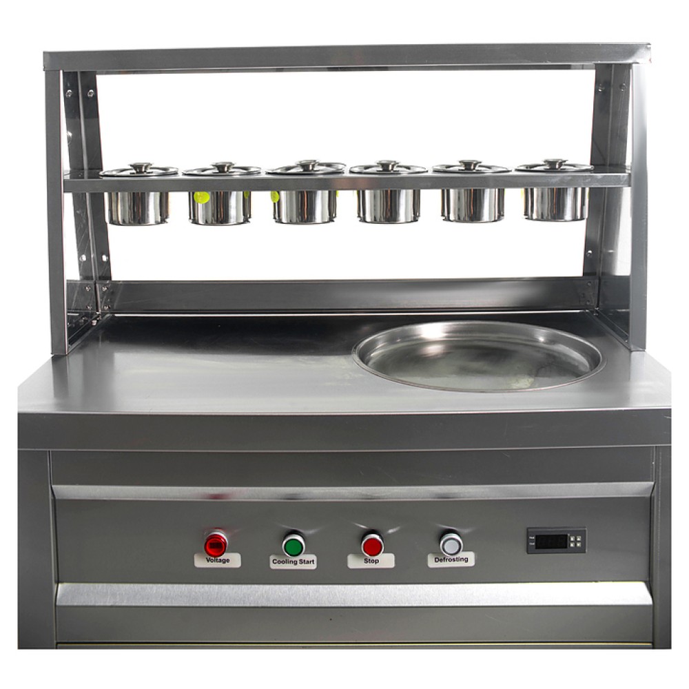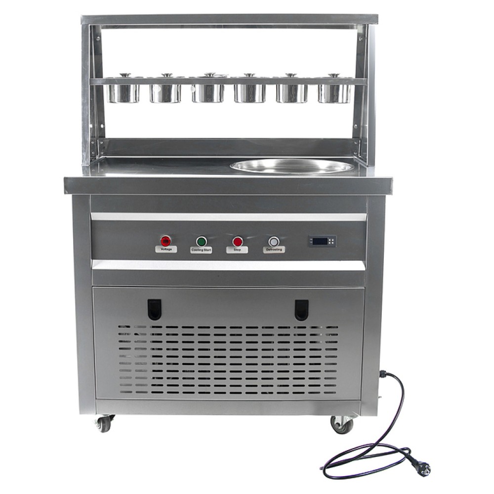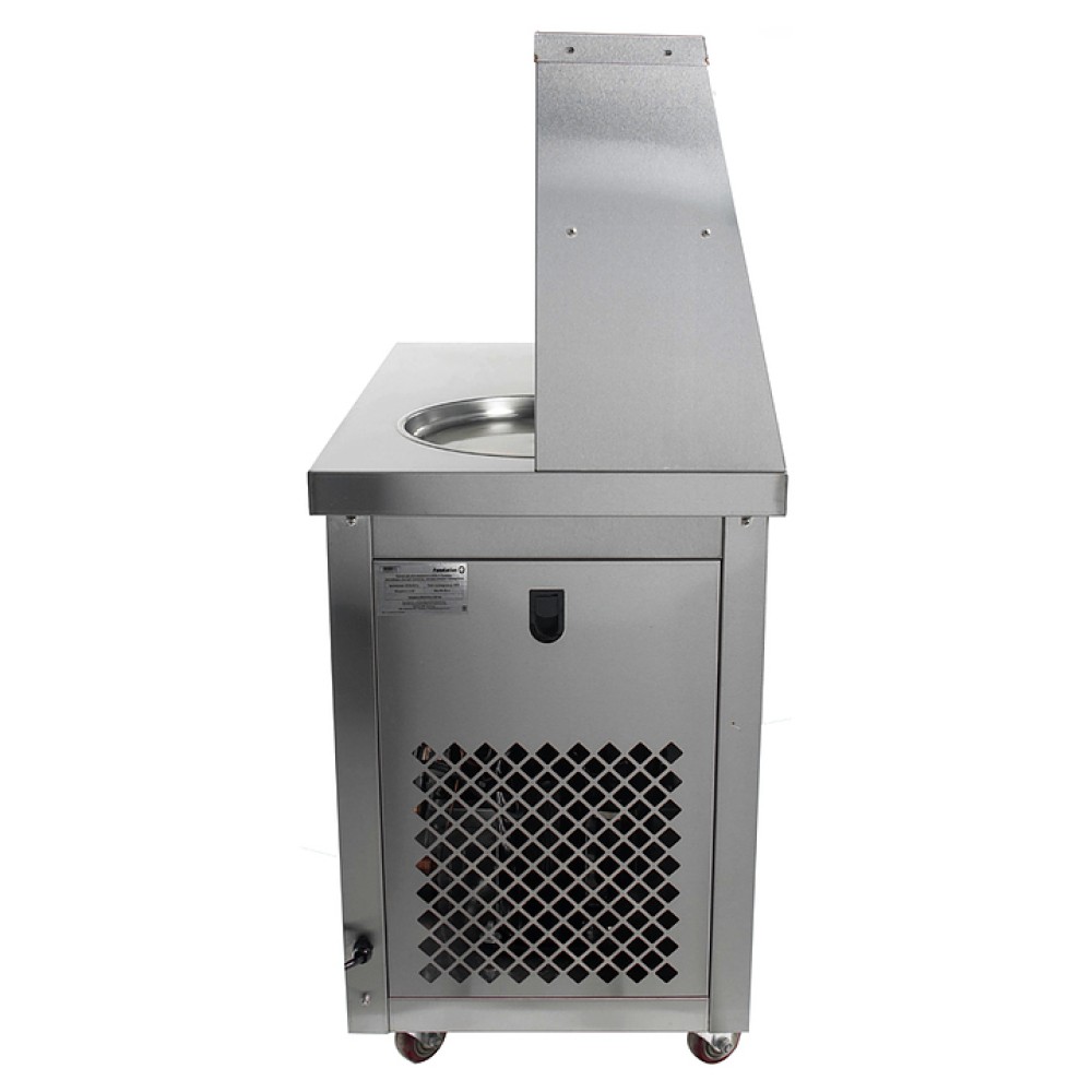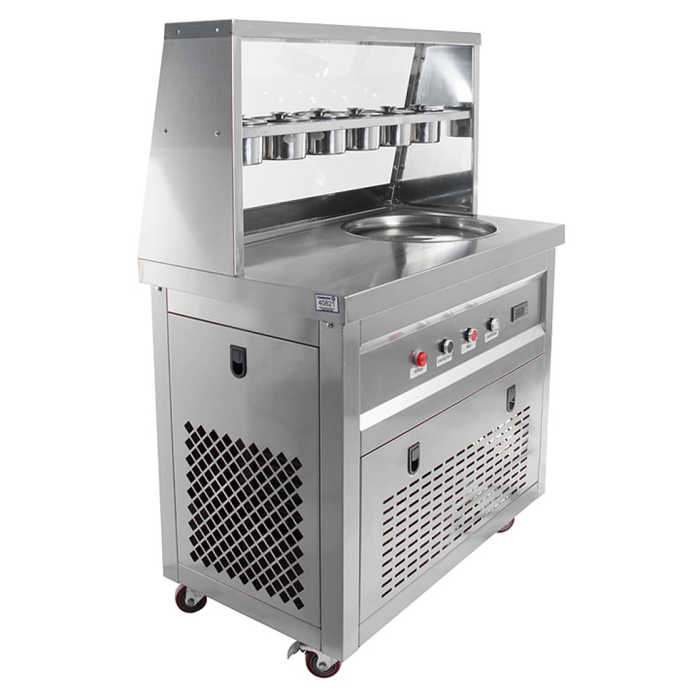Фризер для мороженого Foodatlas KCB-1Y используется на предприятиях общественного питания и торговли для приготовления жареного мороженого в роллах. Модель оснащена механическим управлением, термоконтроллером, столом для топпиногов, 3 цилиндрическими контейнерами, круглой охлаждаемой поверхностью для "жарки" десерта при минусовой температуре и 4 колесами, 2 из которых снабжены тормозом. Корпус выполнен из нержавеющей стали 430, сковорода и контейнеры - из нержавеющей стали 304, радиатор - из алюминия.