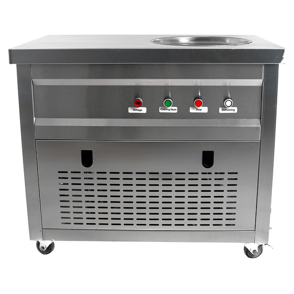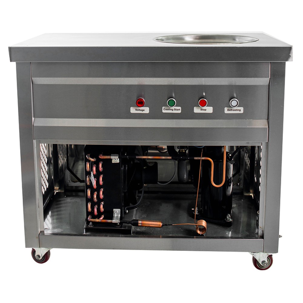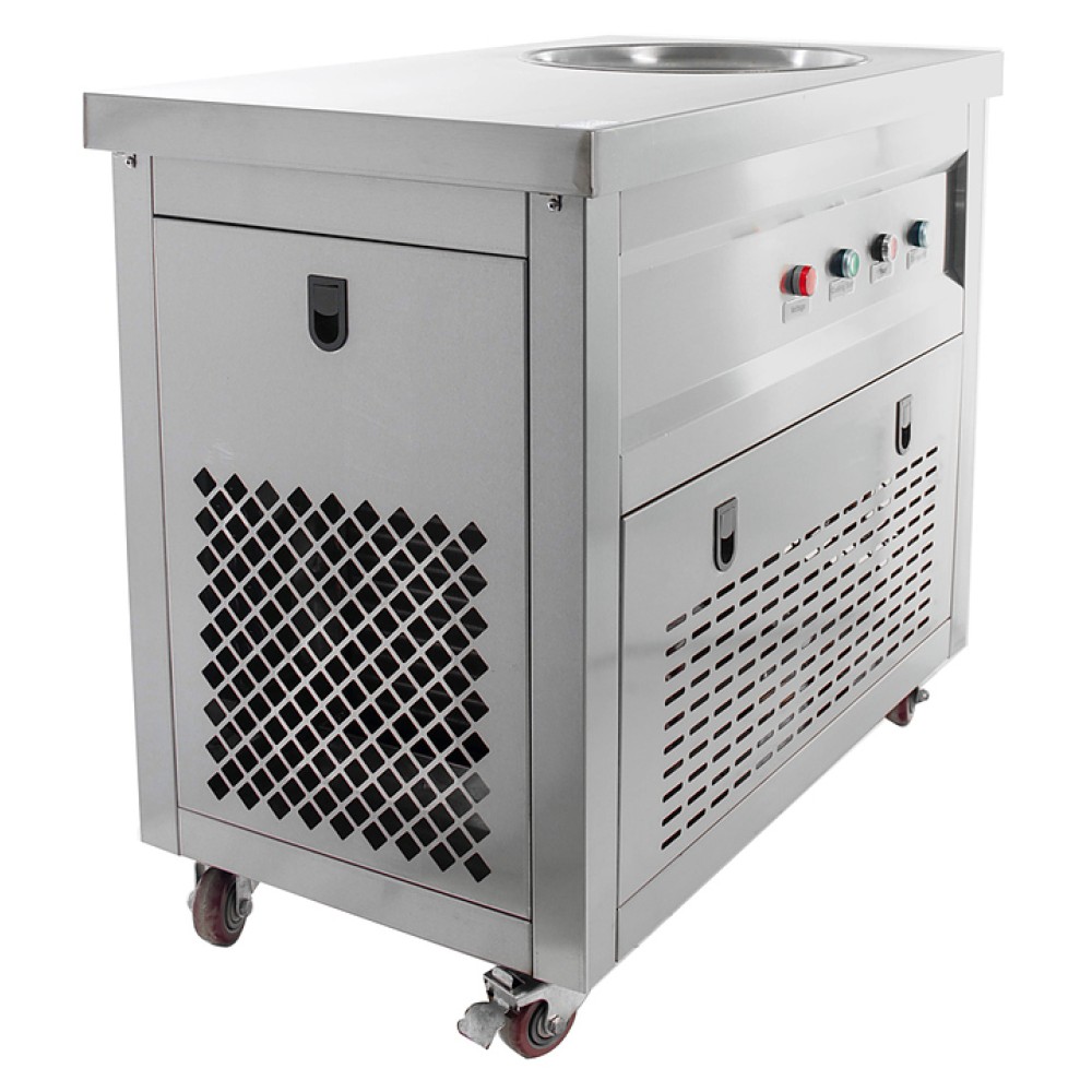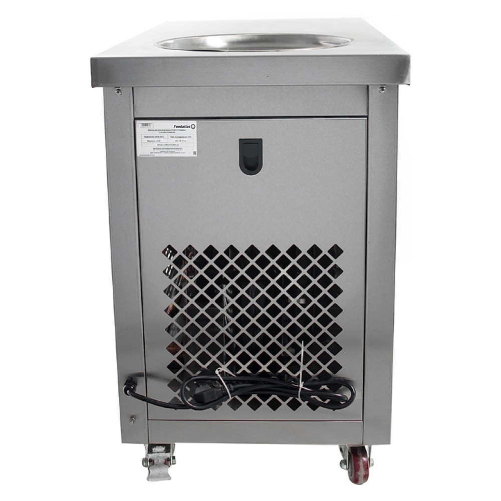 Фризер для мороженого Foodatlas KCB-1Y используется на предприятиях общественного питания и торговли для приготовления жареного мороженого в роллах. Модель оснащена механическим управлением, столом для топпиногов, круглой охлаждаемой поверхностью для "жарки" десерта при минусовой температуре и 4 колесами, 2 из которых снабжены тормозом. Корпус выполнен из нержавеющей стали 430, сковорода - из нержавеющей стали 304, радиатор - из алюминия.
