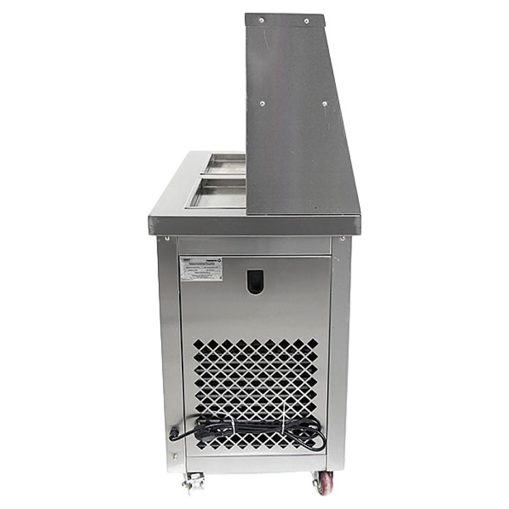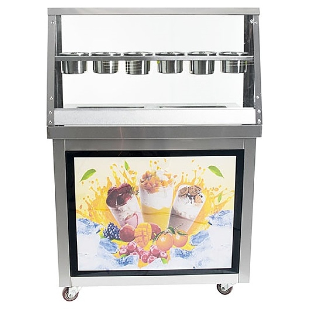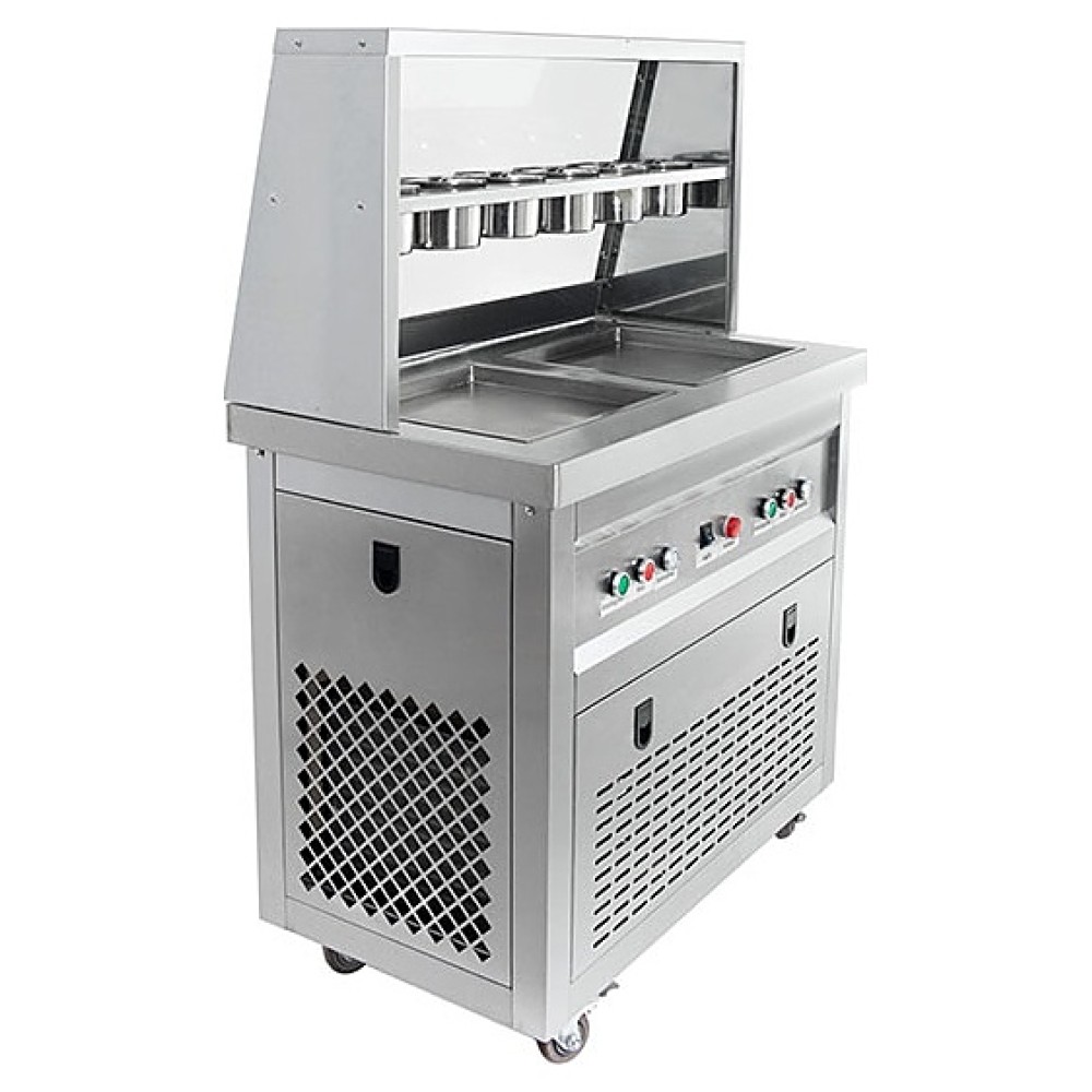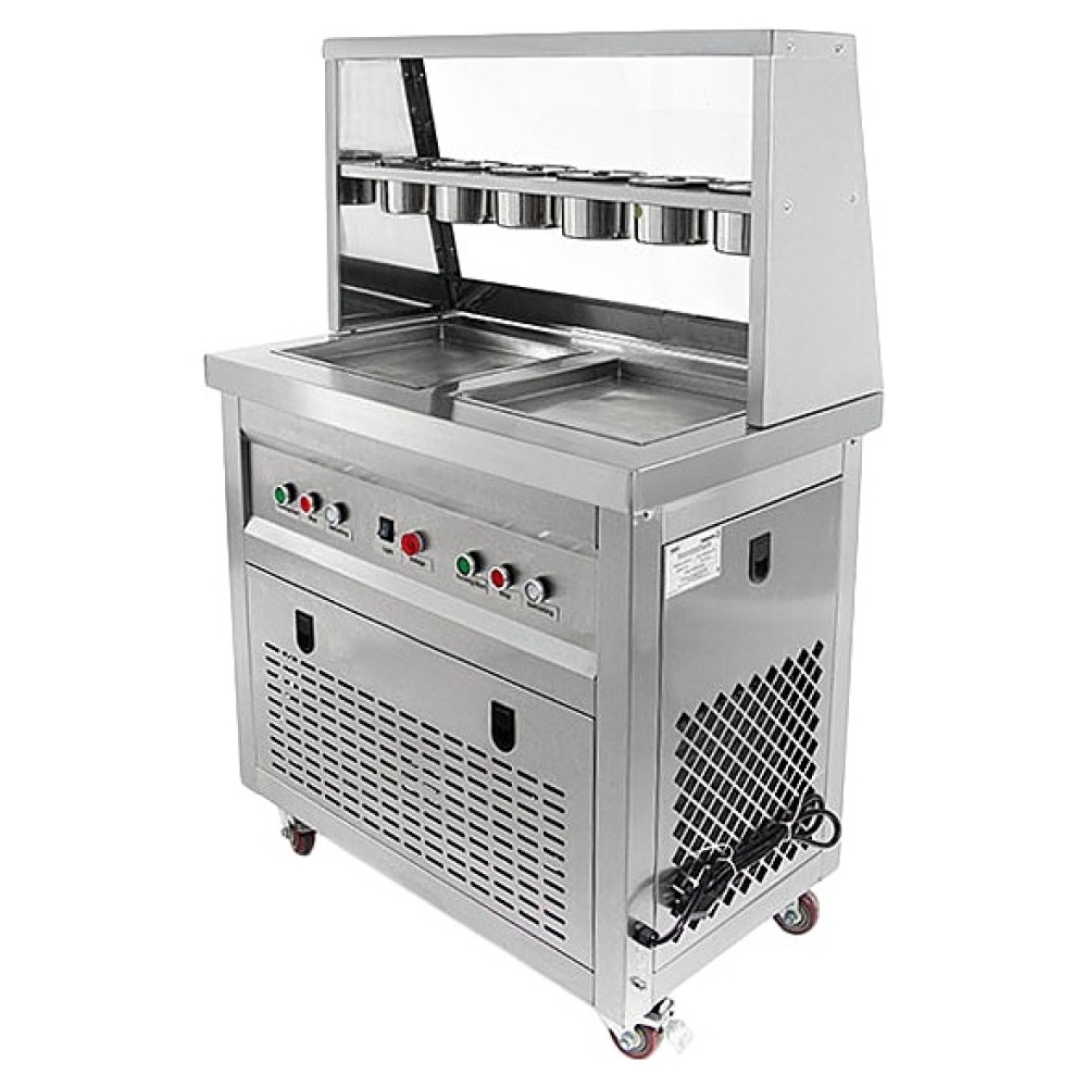 Напольный фризер для мороженого Foodatlas KCB-2F используется на предприятиях общественного питания и торговли для приготовления жареного мороженого в роллах. Модель оснащена компрессором, световым коробом, 2 квадратными сковородами для «жарки» десерта при минусовой температуре и последующего скручивания продукта в роллы, кнопочной панелью управления и кабелем питания с евровилкой. Корпус, сковороды и контейнеры выполнены из высококачественной нержавеющей стали, упаковка – фанерный ящик.
