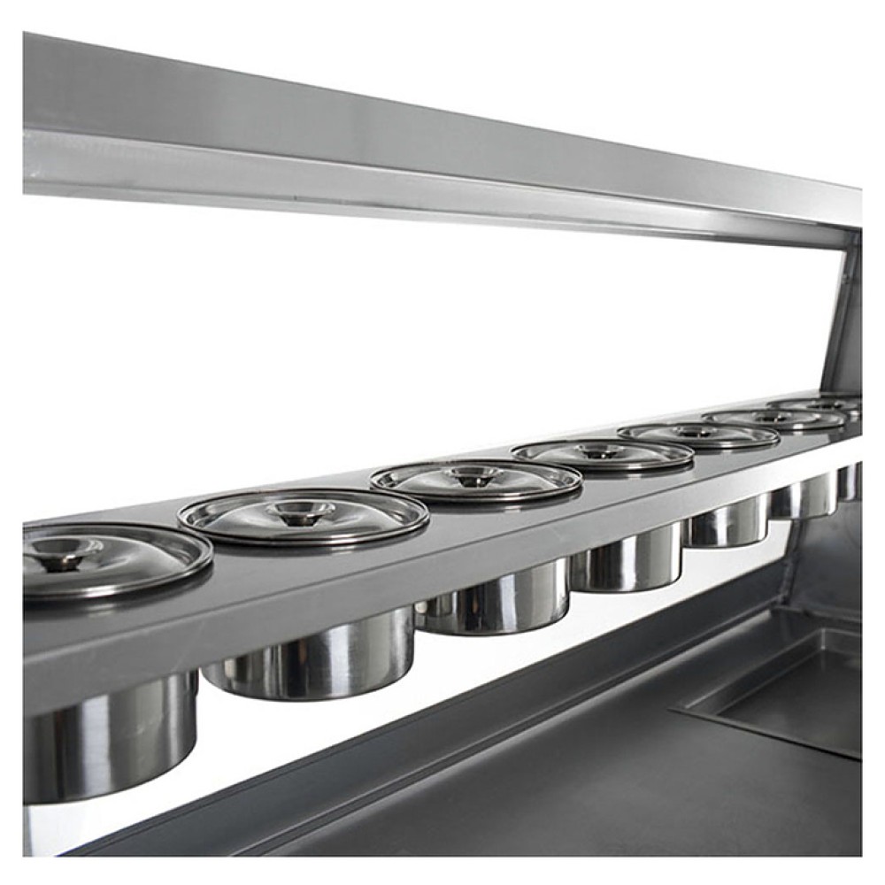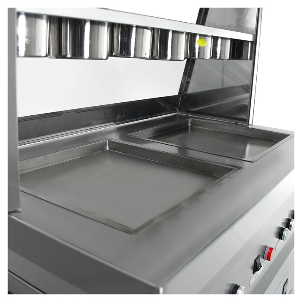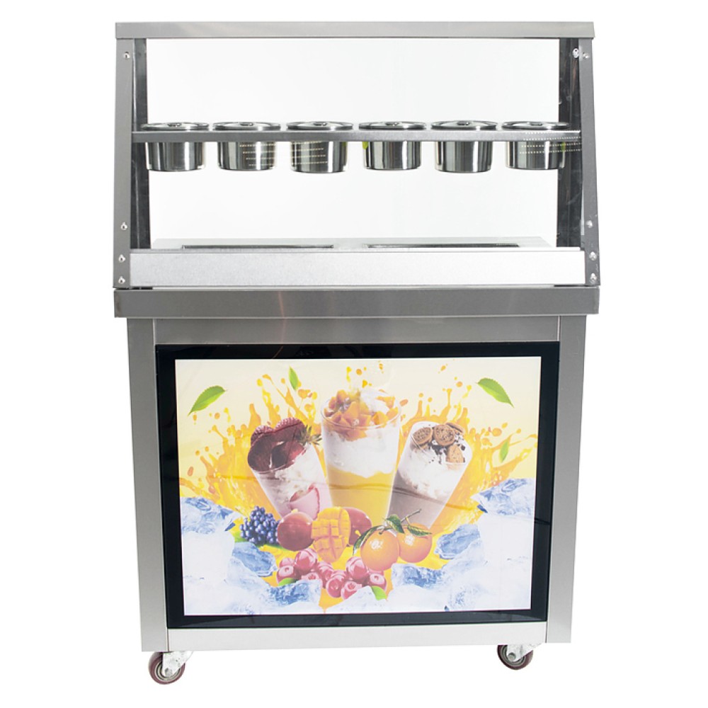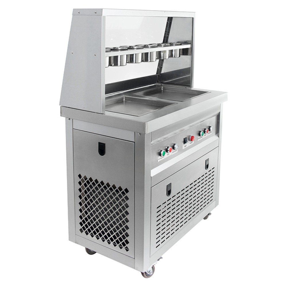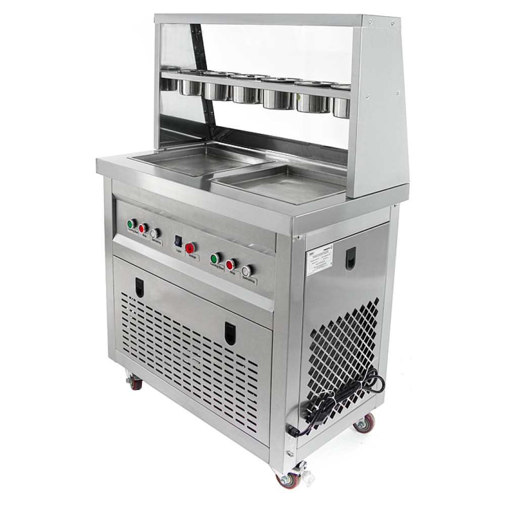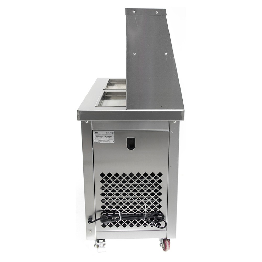 Фризер для мороженого Foodatlas KCB-2F используется на предприятиях общественного питания и торговли для приготовления жареного мороженого в роллах. Модель оснащена механическим управлением, 6 квадратными контейнерами, световым коробом, 2 квадратными охлаждаемыми поверхностями для "жарки" десерта при минусовой температуре и 4 колесами, 2 из которых снабжены тормозом. Корпус выполнен из нержавеющей стали 430, сковорода и контейнеры - из нержавеющей стали 304, радиатор - из алюминия, каркас светового короба - из оргстекла, полотно светового короба - из ПВХ.