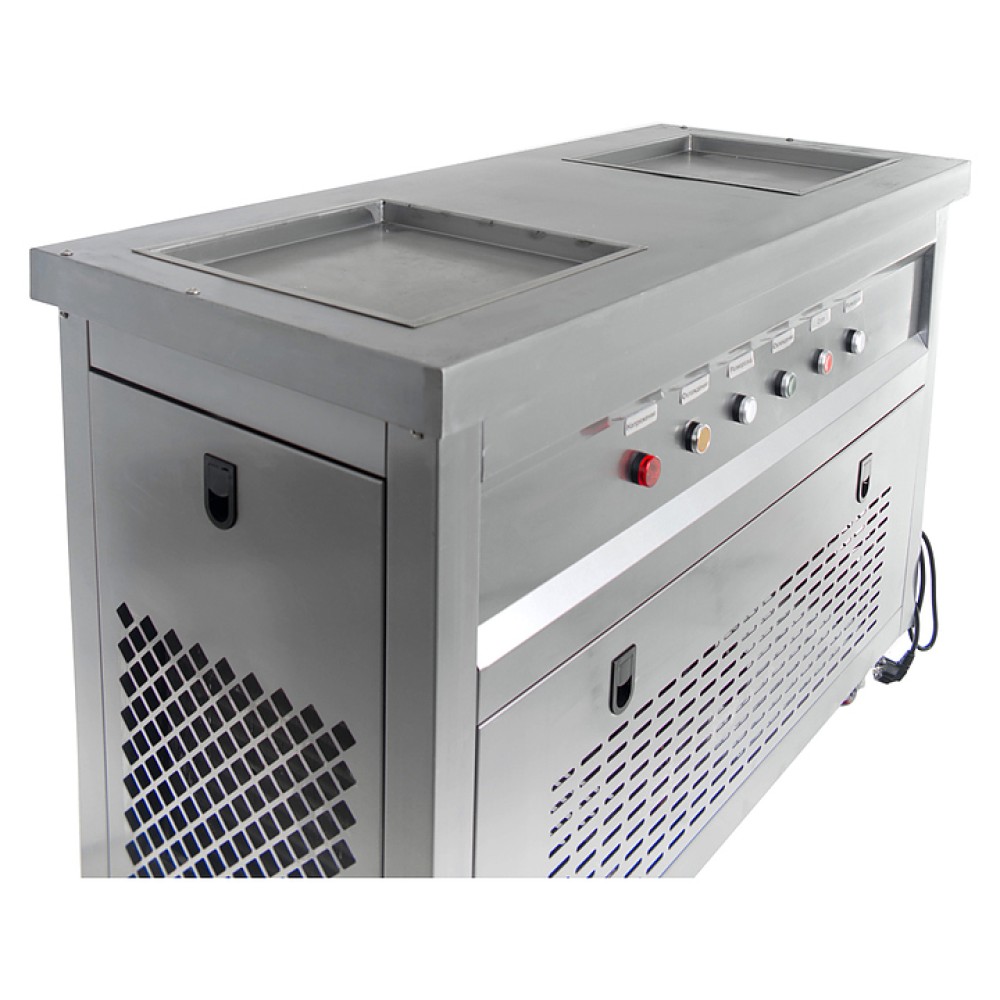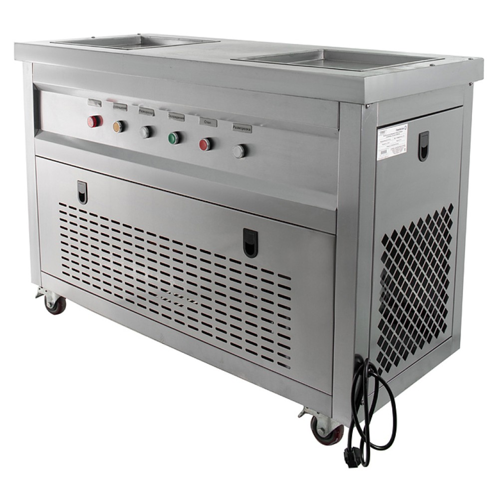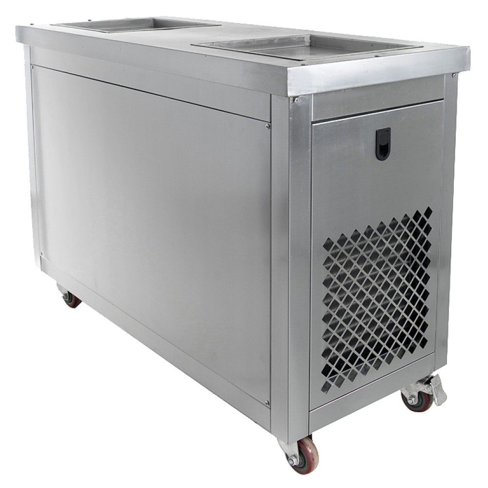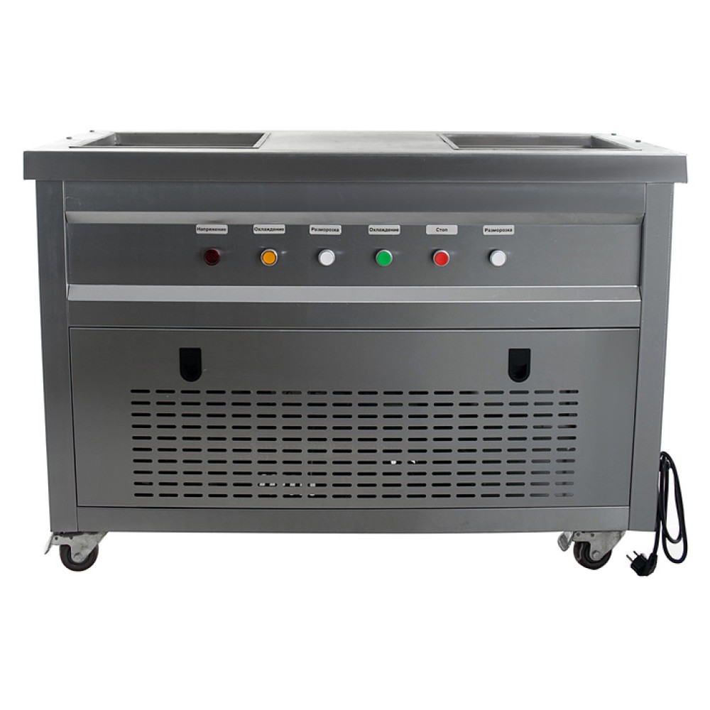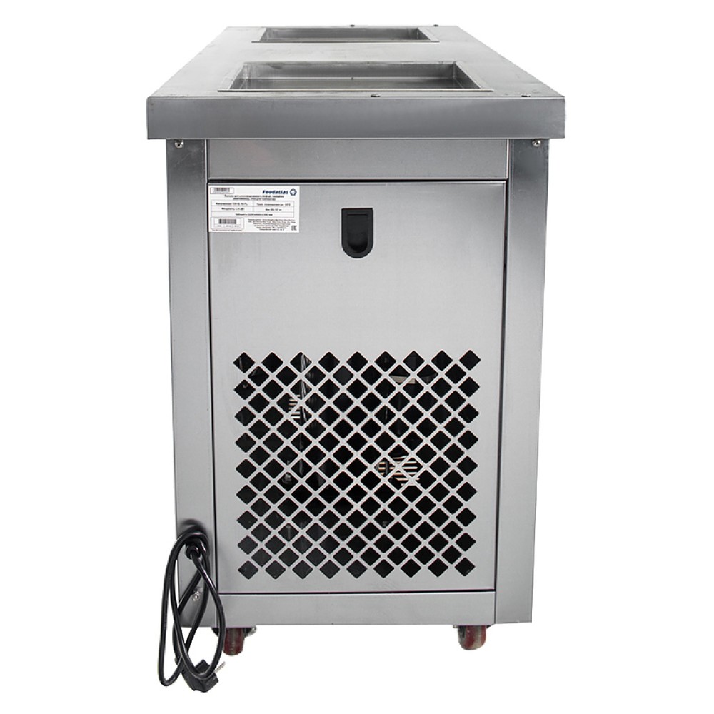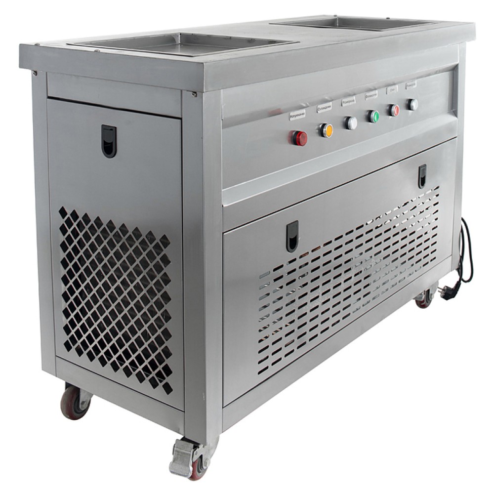 Фризер для мороженого Foodatlas KCB-2F используется на предприятиях общественного питания и торговли для приготовления жареного мороженого в роллах. Модель оснащена механическим управлением, столом для топпингов, 2 квадратными охлаждаемыми поверхностями для "жарки" десерта при минусовой температуре и 4 колесами, 2 из которых снабжены тормозом. Корпус выполнен из нержавеющей стали 430, сковорода - из нержавеющей стали 304, радиатор - из алюминия, каркас светового короба - из оргстекла, полотно светового короба - из ПВХ.