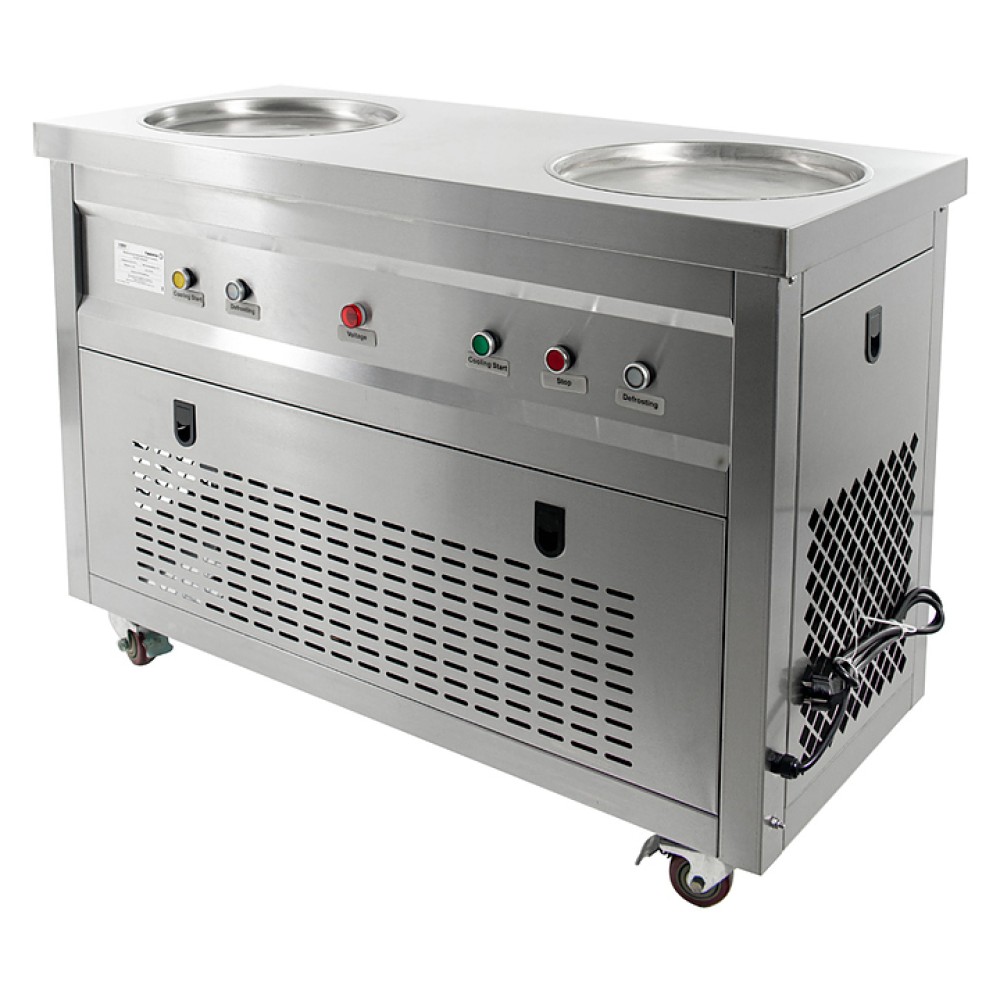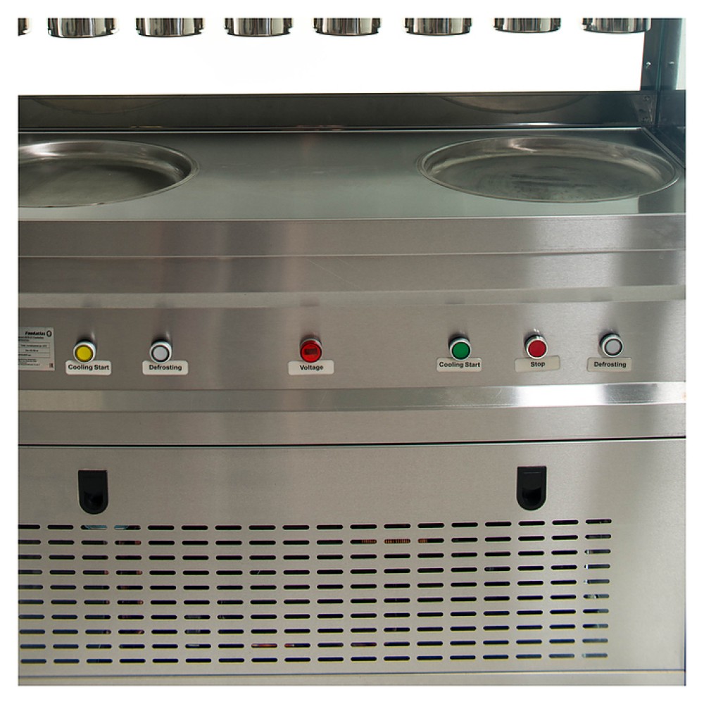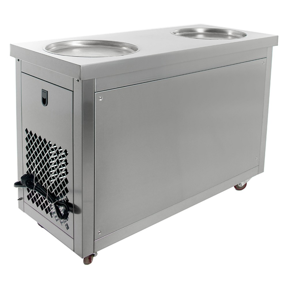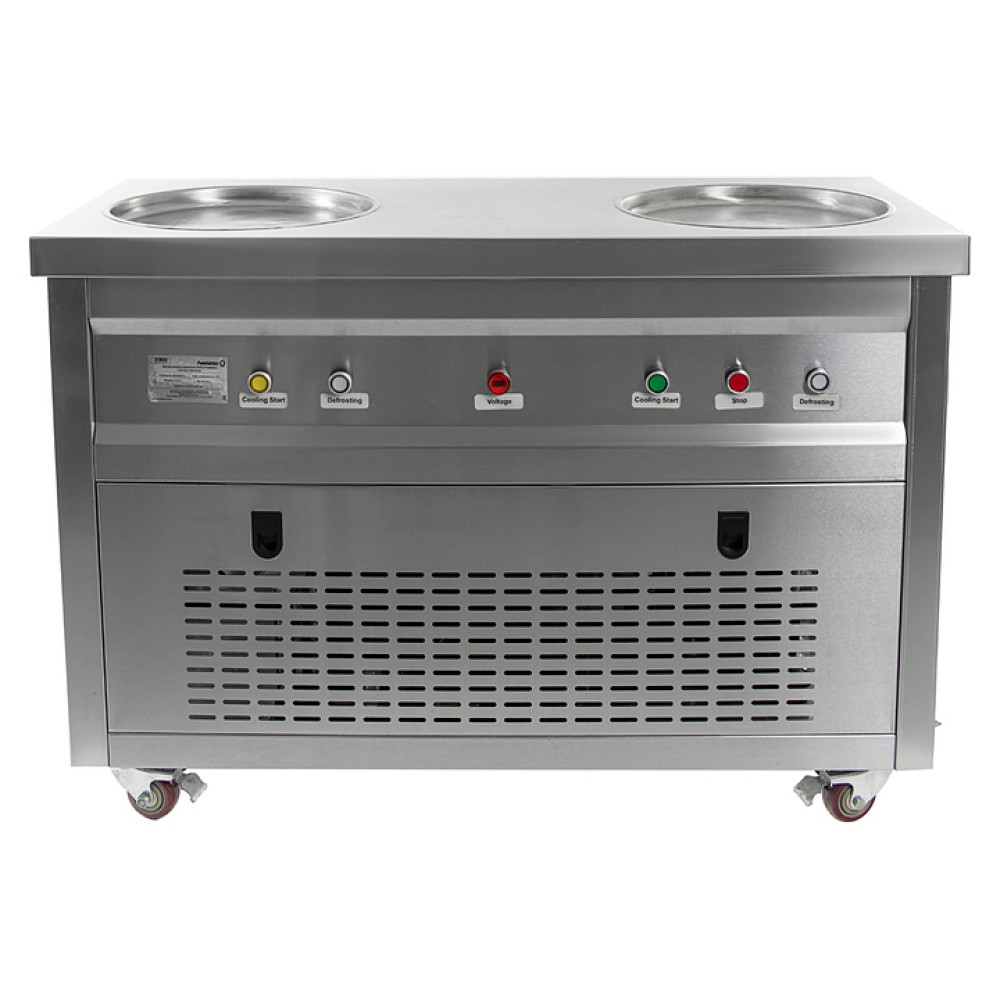Фризер для мороженого Foodatlas KCB-2Y используется на предприятиях общественного питания и торговли для приготовления жареного мороженого в роллах. Модель оснащена механическим управлением, термоконтроллером, столом для топпингов, 2 круглыми охлаждаемыми поверхностями для "жарки" десерта при минусовой температуре и 4 колесами, 2 из которых снабжены тормозом. Корпус выполнен из нержавеющей стали 430, сковорода и контейнеры - из нержавеющей стали 304, радиатор - из алюминия.
