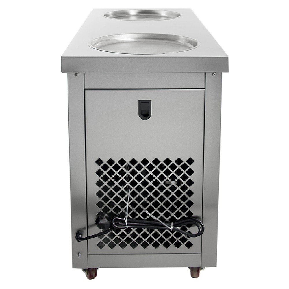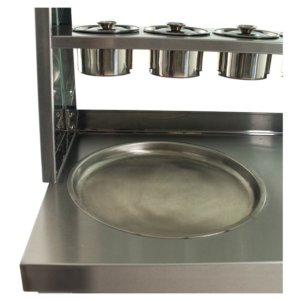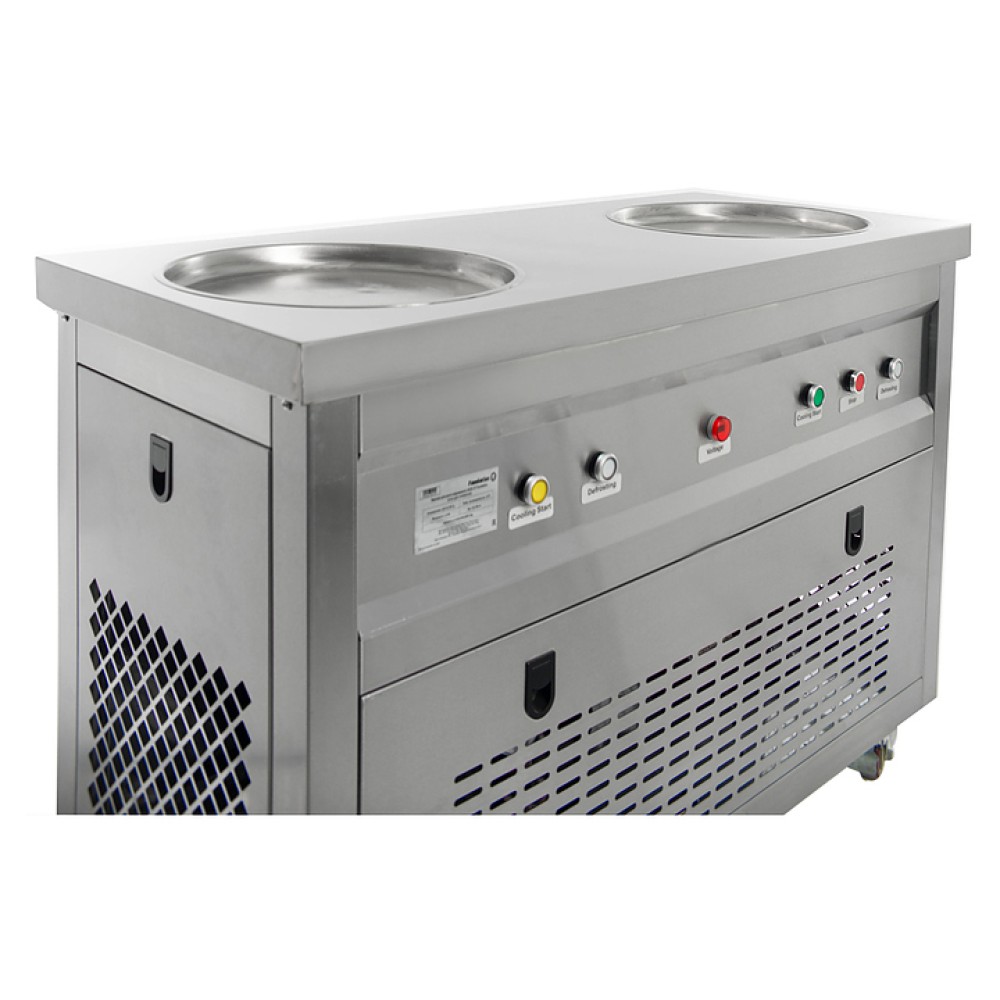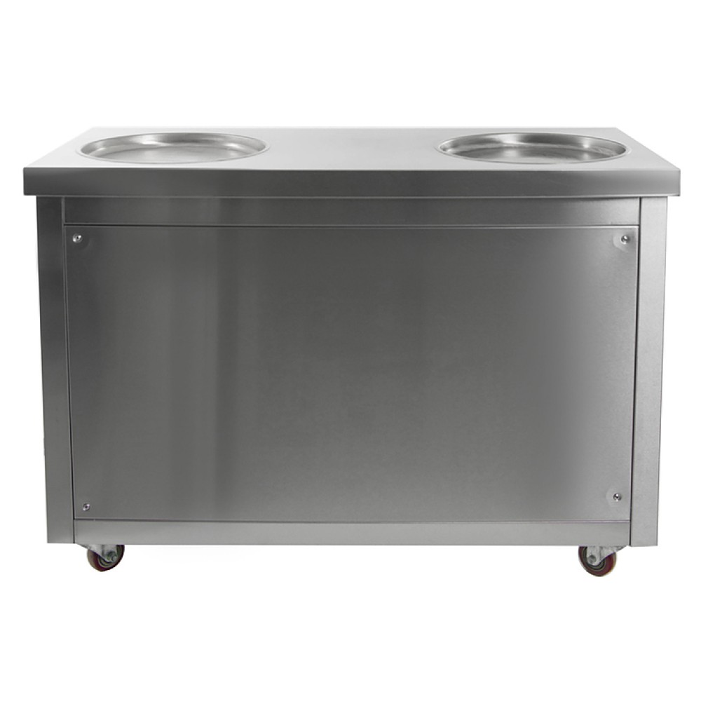 Фризер для мороженого Foodatlas KCB-2Y используется на предприятиях общественного питания и торговли для приготовления жареного мороженого в роллах. Модель оснащена механическим управлением, термоконтроллером, столом для топпингов, 2 круглыми охлаждаемыми поверхностями для "жарки" десерта при минусовой температуре и 4 колесами, 2 из которых снабжены тормозом. Корпус выполнен из нержавеющей стали 430, сковорода и контейнеры - из нержавеющей стали 304, радиатор - из алюминия.