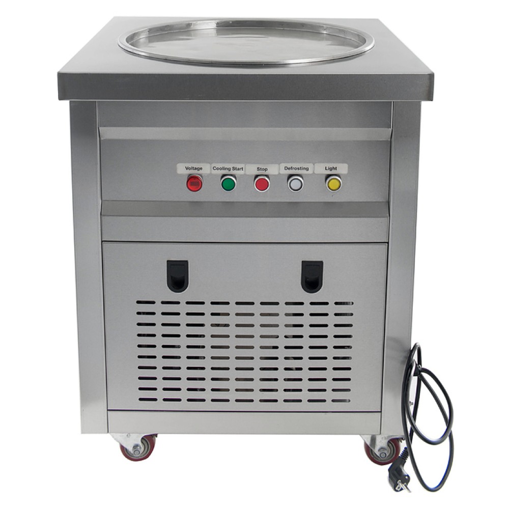 Фризер для мороженого Foodatlas KCD-1Y используется на предприятиях общественного питания и торговли для приготовления жареного мороженого в роллах. Модель оснащена механическим управлением, световым коробом, круглой охлаждаемой поверхностью для "жарки" десерта при минусовой температуре и 4 колесами, 2 из которых снабжены тормозом. Корпус выполнен из нержавеющей стали 430, сковорода - из нержавеющей стали 304, радиатор - из алюминия, каркас светового короба - из оргстекла, полотно светового короба - из ПВХ.