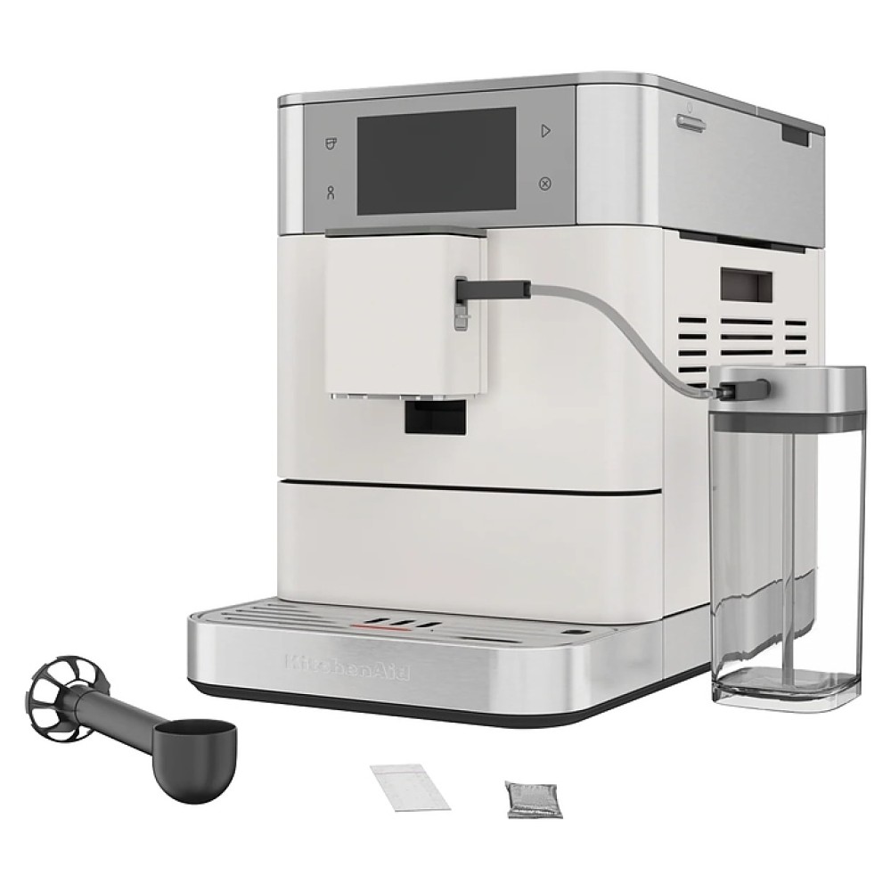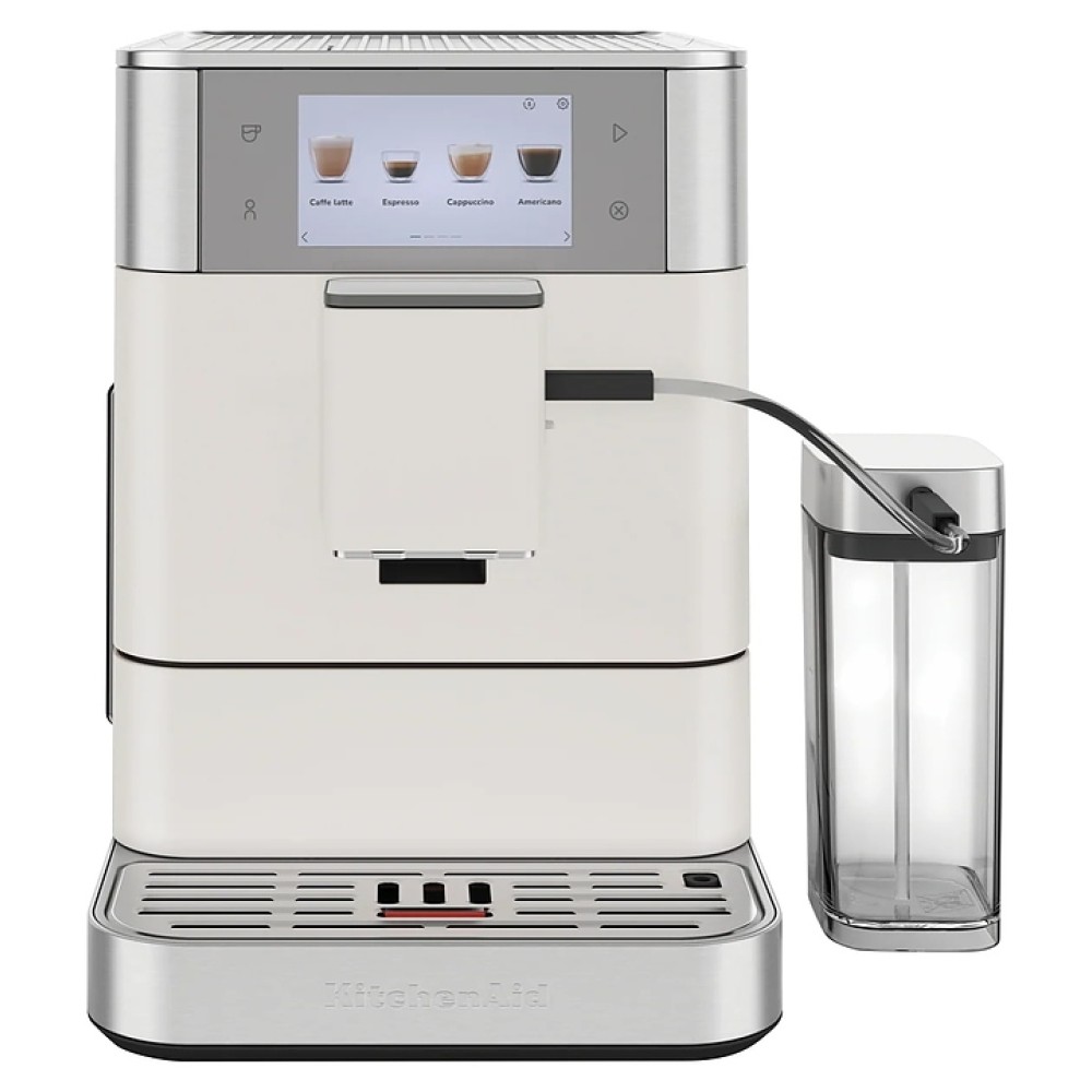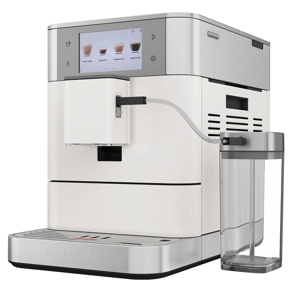 Автоматическая эспрессо кофемашина KitchenAid KF8 5KES8558EPL предназначена для приготовления кофе эспрессо и напитков на его основе в домашних условиях. Модель оснащена встроенными насосом и капучинатором, диспенсером с 2 соплами, кабелем питания с вилкой и расположенной на фронтальной стенке электронной панелью с сенсорными функциональными клавишами и информативным цветным сенсорным дисплеем управления и индикации. Корпус прямоугольно ориентированной формы выполнен из металла и АБС-пластика с поверхностью оттенка с поверхностью оттенка фарфоровый белый (Porcelain), окантовки по периметру верхей части и основания с серебристой поверхностью, жернова кофемолки – из закаленной стали.