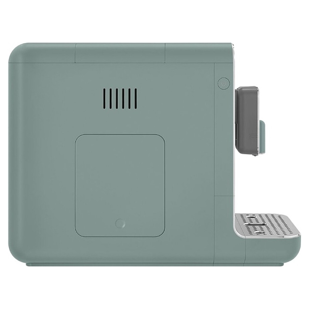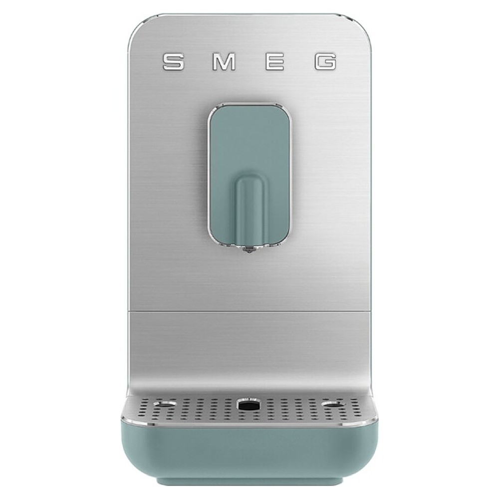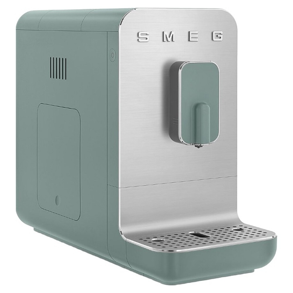 Автоматическая эспрессо кофемашина SMEG BCC01EGMEU предназначена для приготовления кофе эспрессо и напитков на его основе в домашних условиях. Модель оснащена кабелем питания с евровилкой (Shuko) и панелью управления с нажимными кнопками. Корпусы прибора и основания подставки для чашек, фронт диспенсера, рукоятка и кнопки выполнены из пластика с внешней поверхностью изумрудно-зеленого оттенка, фронтальная панель и поддон для чашек – из алюминия с сатинированной поверхностью и полированной кромкой, объемные накладные литеры логотипа – из пластика с серебристой поверхностью, бойлер – из нержавеющей стали, резервуар для воды – из сополимера стирола и акрилонитрила (SAN) дымчатого оттенка, корпус диспнсера и рукоятка резервуара – из серого пластика, изоляция кабеля серого цвета.