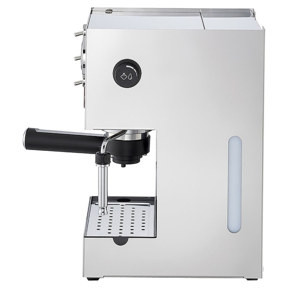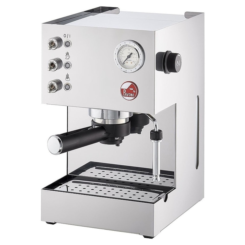 Рожковая эспрессо кофемашина La Pavoni LPMGCM03EU серии Gran Caffè используется для приготовления кофе и напитков на его основе в домашних условиях. Модель оснащена вибрационной помпой, капучинатором в виде трубки с паровой насадкой, подставкой для чашек, кабелем питания с евровилкой и расположенной на фронтальной стенке электромеханической панелью управления. Корпус прямоугольно ориентированной формы выполнен из нержавеющей стали с серебристой поверхностью и глянцевой полировкой, заварочный блок – из латуни с хромированной поверхностью, ручка регулятора и поддон каплесборника – из черного пластика, трубка и насадка капучинатора – из нержавеющей стали, решетка подставки – из стали, опоры – из черного полимера.