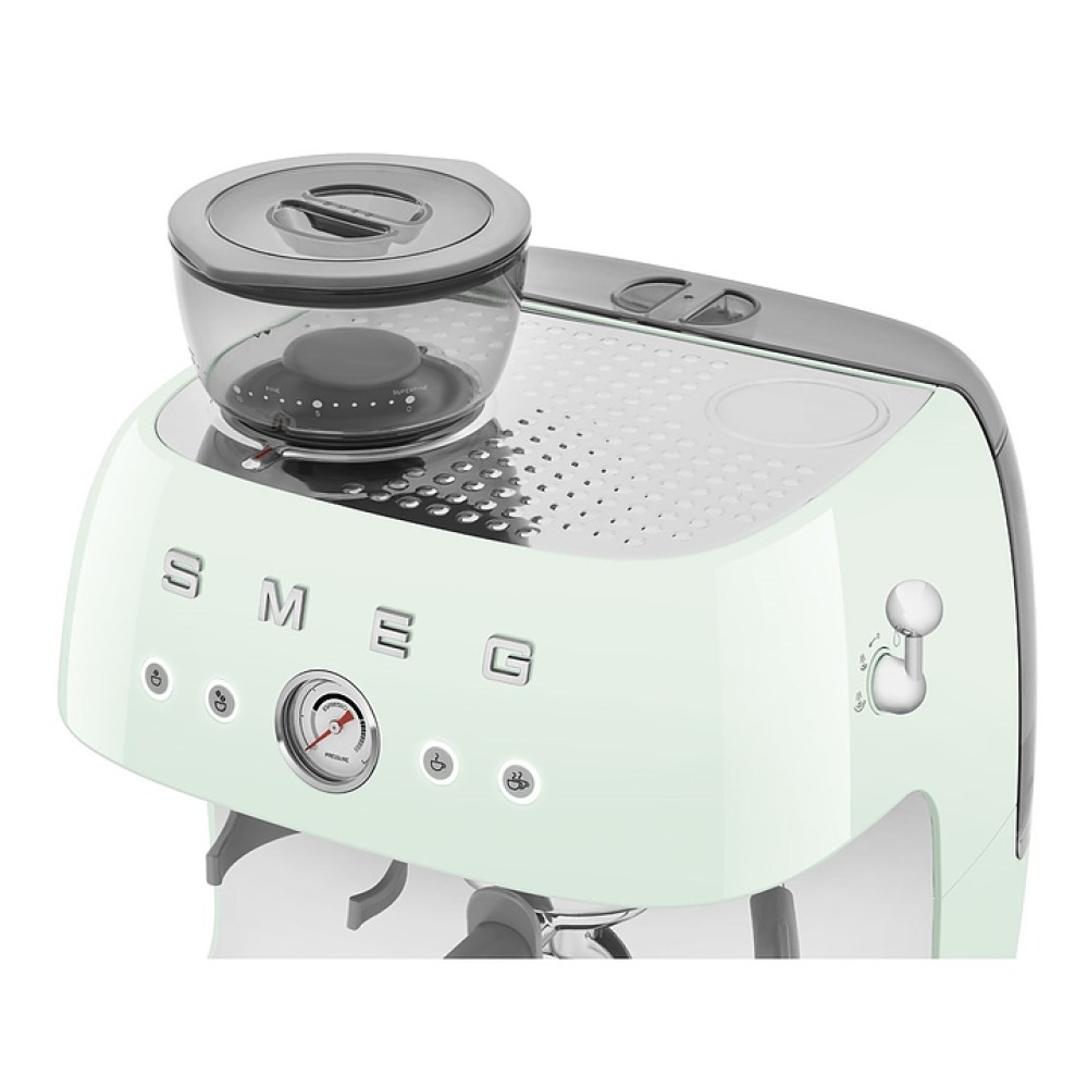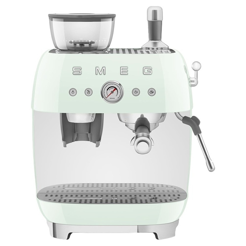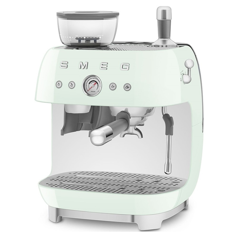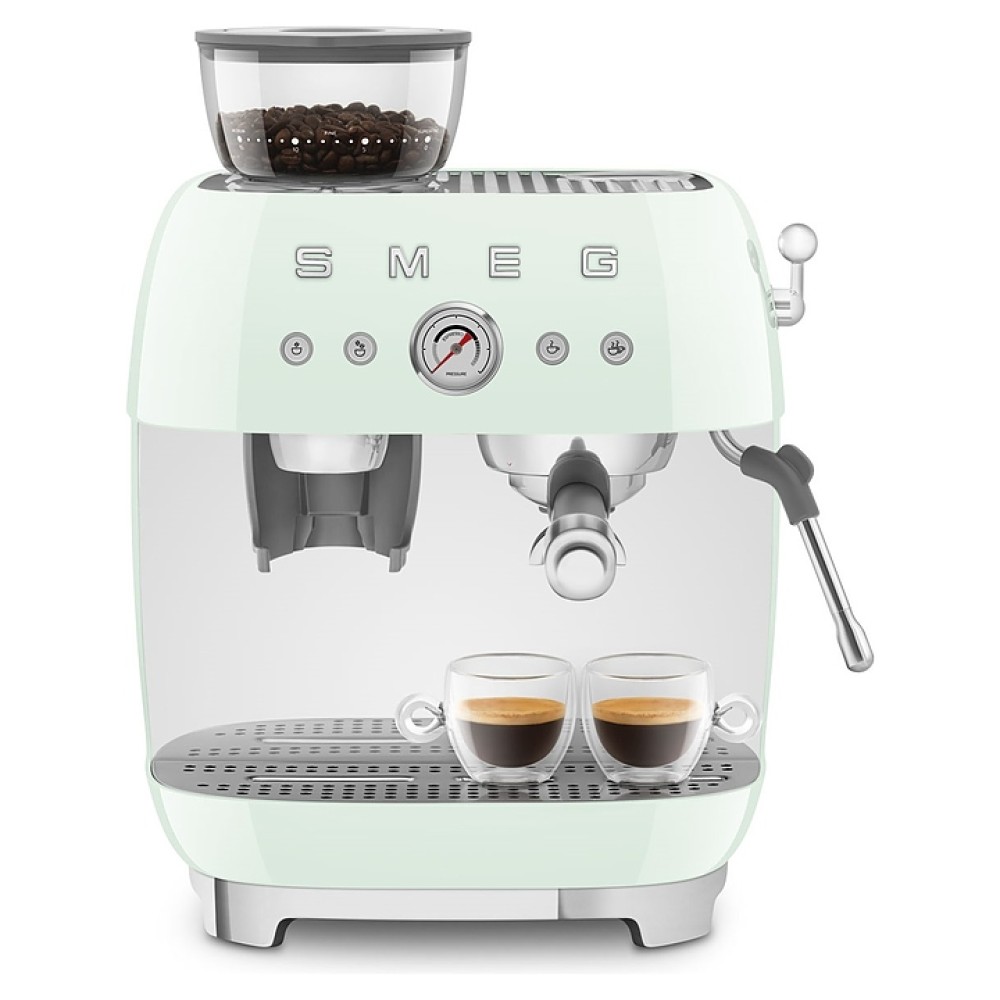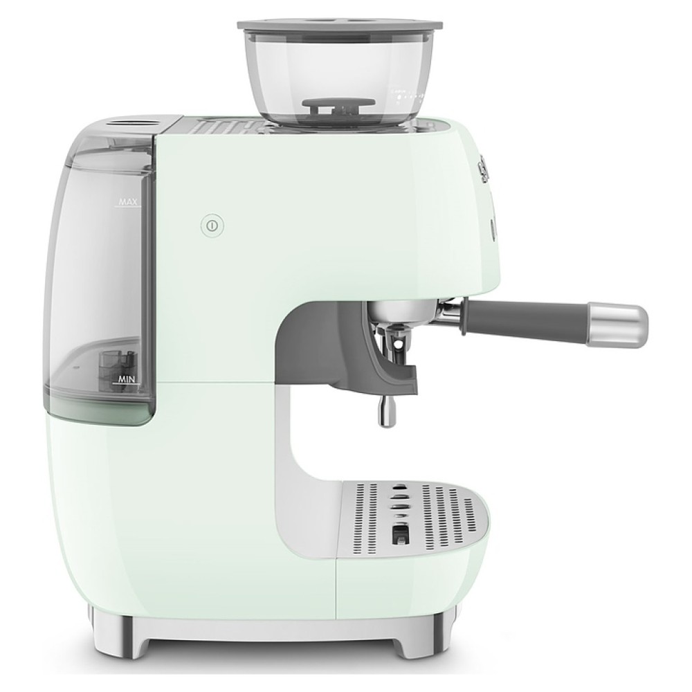 Эспрессо кофемашина SMEG EGF03PGEU предназначена для приготовления кофе эспрессо и напитков на его основе в домашних условиях. Модель оснащена кабелем питания с евровилкой (Shuko) и панелью управления с нажимными кнопками. Корпусы прибора и основания подставки для чашек выполнены из литого алюминия с внешним глянцевым покрытием пастельного зеленого оттенка, бойлер, жернова, трубка подачи горячей воды / пара, подогреватель и поддон для чашек, питчер, фильтры, корпусы темпера и холдера – из нержавеющей стали, рычаг подачи пара – из сплава цинка, резервуар для воды с крышкой и контейнер для зерен – из сополимера стирола и акрилонитрила (SAN), крышка контейнера для зерен с интегрированной ручкой – из термопластичного элестомера (TPE), рукоятки холдера и темпера – из серого пластика.