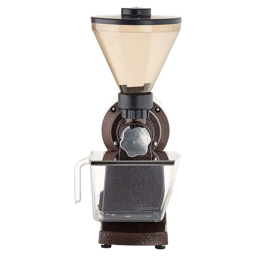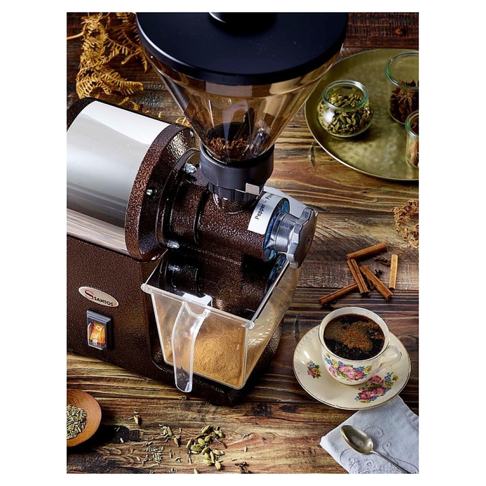 Электрическая кофемолка Santos 01 используется для измельчения кофейных зерен в кофейнях, барах, кафе, специализированных магазинах, на других предприятиях общественного питания и торговли. Модель оснащена воронкообразным загрузочным бункером с крышкой и кабелем питания с вилкой (Shuko). Корпус выполнен из алюминия с покрытием коричневого цвета c эффектом молотковой эмали и вставкой из нержавеющей стали с серебристой поверхностью на моторном отсеке, жернова – из высококачественной закаленной стали, контейнер – из безопасного для пищевой промышленности пластика без содержания бисфенола A.