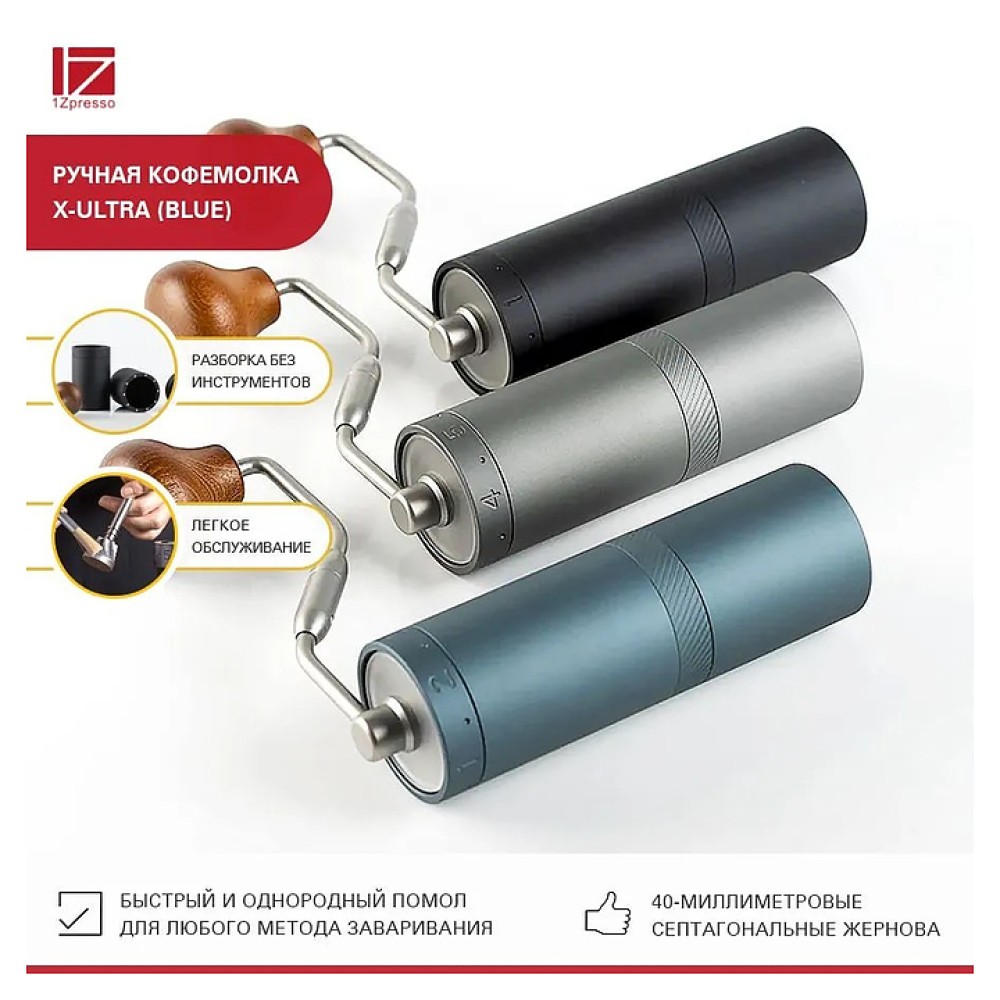 Ручная кофемолка 1Zpresso X-Ultra используется на предприятиях общественного питания и торговли, в офисах и частных домах для получения молотого кофе из зерен. Модель оснащена септагональными жерновами и магнитным фиксатором бункера.