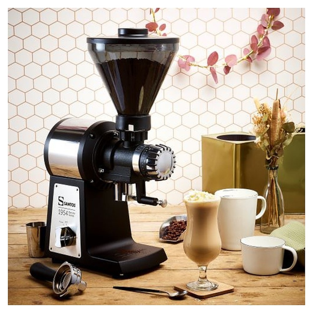 Кофемолка Santos 01BAR используется в кофейнях, барах, кафе, на других предприятиях общественного питания и торговли, а также в домашних условиях для измельчения кофейных зерен. Модель оснащена воронкообразным бункером для кофейных зерен с крышкой. Корпус выполнен из из алюминия и нержавеющей стали.