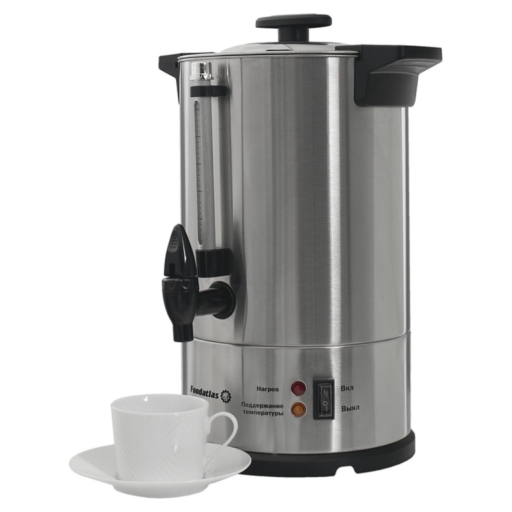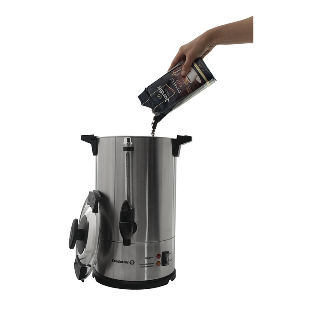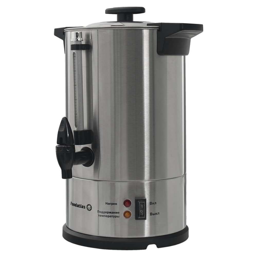 Кофеварка-перколятор Foodatlas WB-DWC6L предназначен для подогрева воды и приготовления горячих напитков на предприятиях общественного питания и торговли, а также в домашних условиях. Модель оснащена кабелем питания с вилкой, краном для розлива, крышкой с грибовидной рукояткой, боковыми транспортировочными рукоятками и электромеханическим управлением. Корпус цилиндрической формы, крышка и фильтр выполнены из высококачественной нержавеющей стали, фурнитура – из черного пластика, упаковка – картонная коробка.