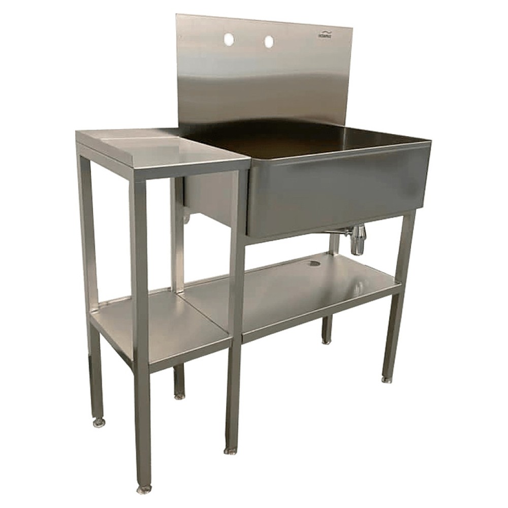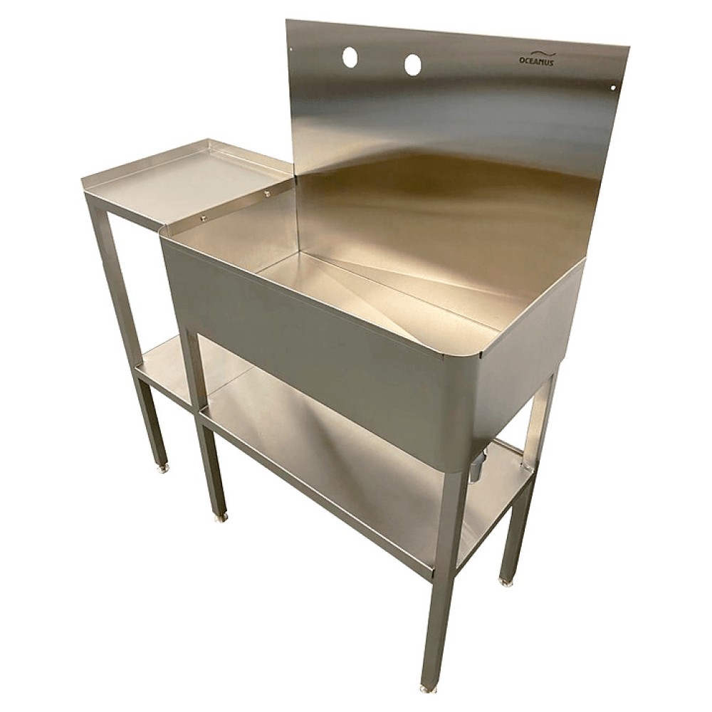 Напольная моечная ванна Oceanus 6-010.2 предназначена для санитарной обработки различного инвентаря на предприятиях общественного питания и других направлений. Модель оснащена раковиной прямоугольной формы справа c высоким задним бортом и 2 отверстиями под краны, рабочей поверхностью слева с задним и боковым бортами, сплошной полкой снизу и 6 опорами. Изделие выполнено из высококачественной нержавеющей стали марки AISI 304 серебристого оттенка с матовой поверхностью.