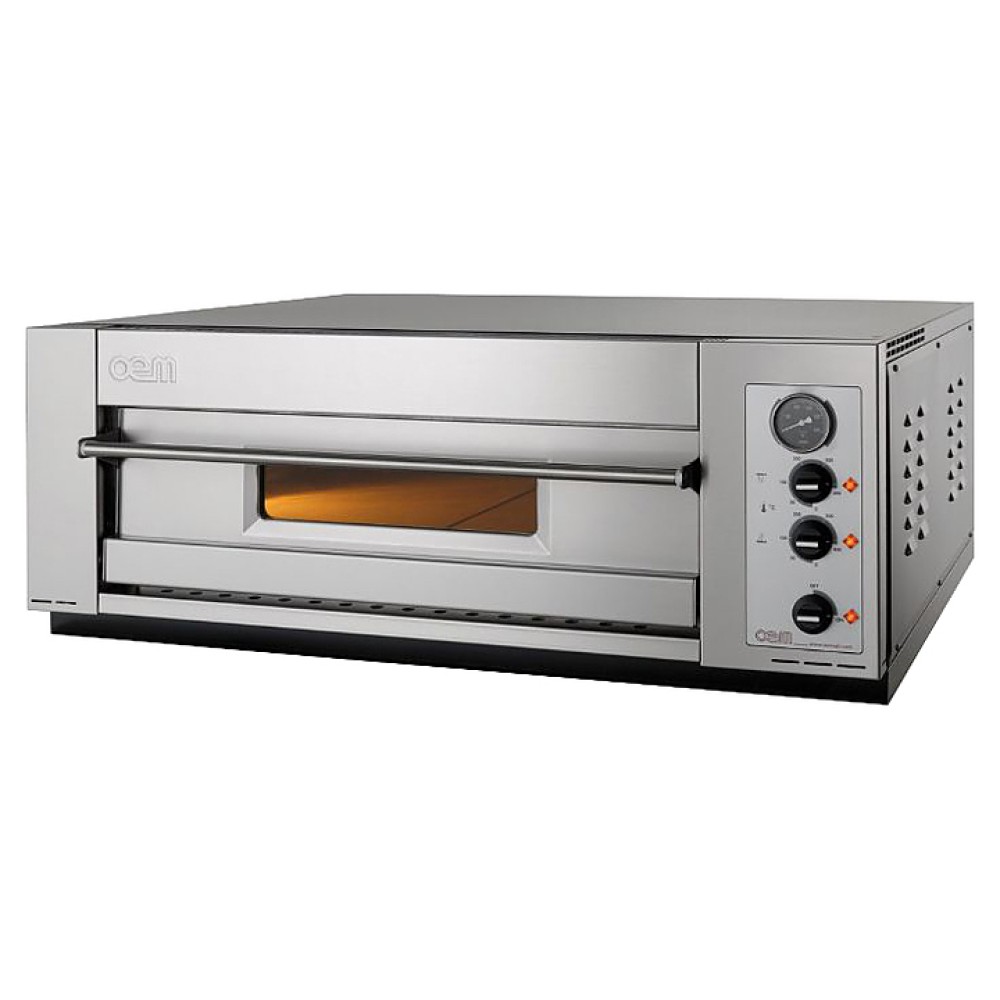 Подовая печь для пиццы OEM-ALI OMDM430 серии Domitor используется на предприятиях пищевой промышленности, общественного питания и торговли, в пекарнях и кондитерских. Модель оснащена электромеханической панелью управления с 2 термостатами верха и пода камеры. Фронтальная часть и дверь выполнены из нержавеющей стали AISI 401, камера и каркас - из алюминизированной стали, боковая, нижняя, верхняя и тыльная панели - из эмалированной стали, под - из керамики.