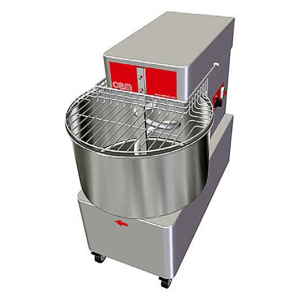 Тестомесильная машина OEM-ALI FA121 (OMFA121) с фиксированным месильным органом. Решетка позволяет производить загрузку ингредиентов без остановки замеса. Машина установлена на ножках, колеса поставляются отдельно.