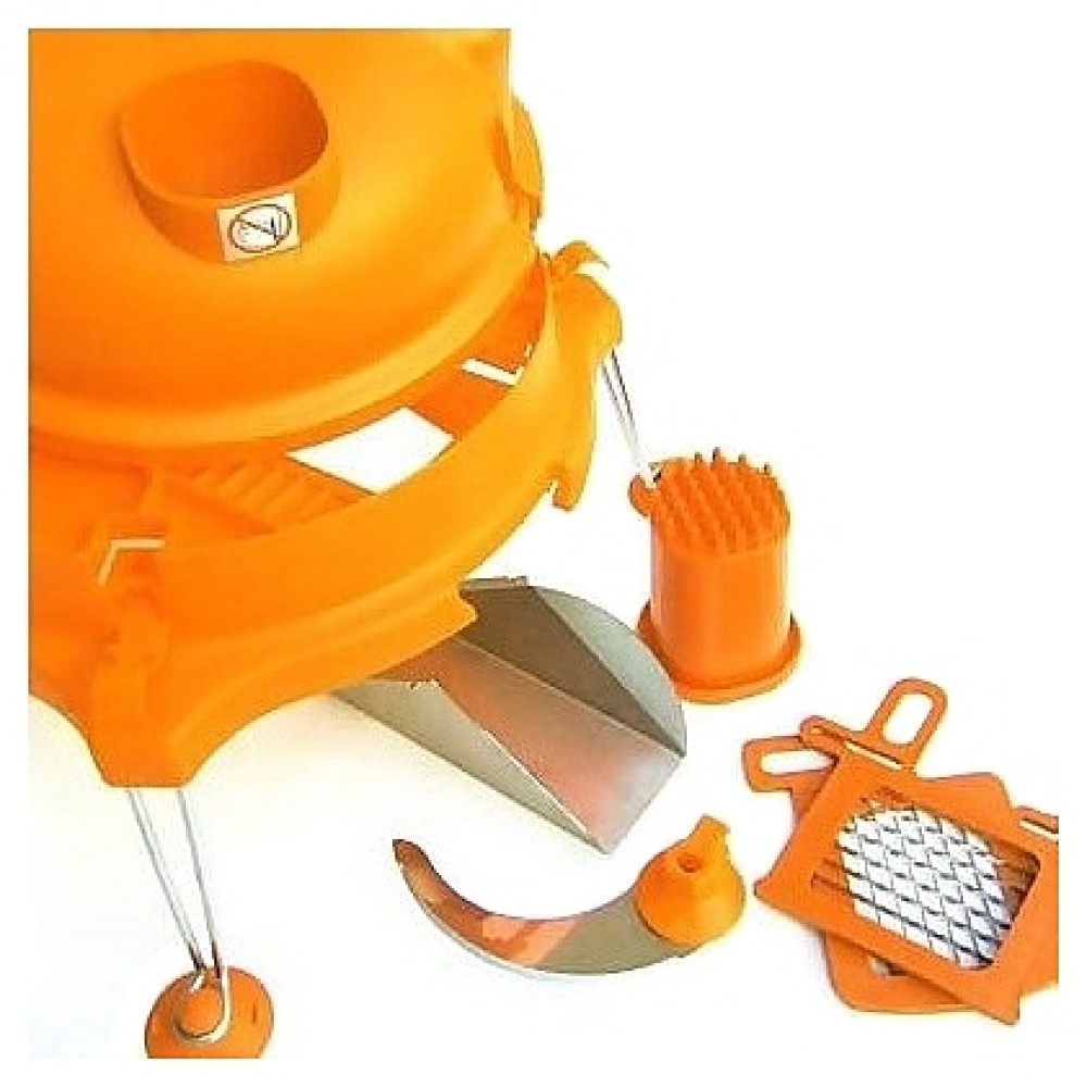 Овощи и фрукты помещаются внутрь овощерезки и слегка придавливаются специальным толкателем, после чего оператор начинает вращать боковую ручку. Нарезанные продукты выходят из отверстия, расположенного с обратной стороны устройства. Прибор оснащен 3 металлическими ножками с антискользящими накладками. Корпус овощерезки выполнен из высококачественного полипропилена.