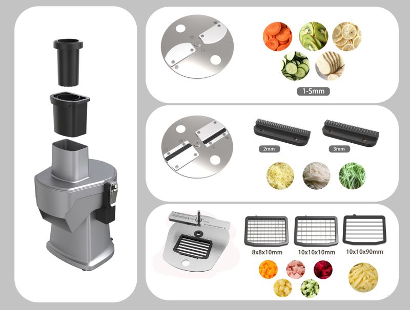 Настольная электрическая овощерезка Hurakan HKN-FNT-ES используется на предприятиях пищевой промышленности, общественного питания и торговли для нарезки корнеплодов, твердых овощей и фруктов, а также твердого сыра, колбас и других аналогичных продуктов. Модель оснащена вертикальной загрузочной горловиной. Корпус выполнен из алюминия с серебристой поверхностью, ножи – из высококачественной нержавеющей стали.