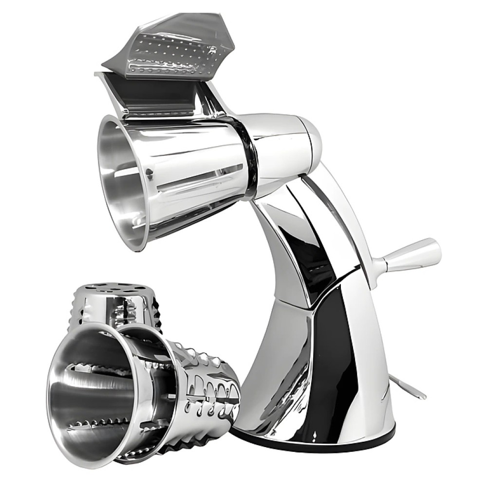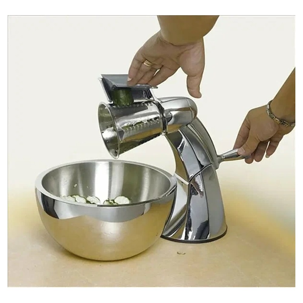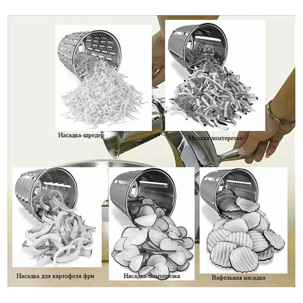 В комплект поставки входят 5 насадок: шредер, мелкая и крупная ломтерезки, терка для картофеля фри и вафельная насадка.