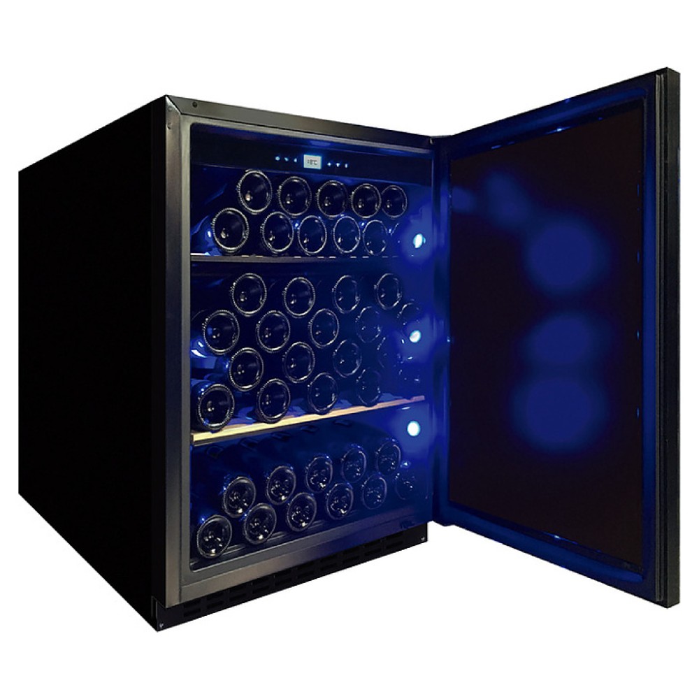 Винный шкаф Pando PBE 89-66 CRR предназначен для хранения при оптимальных условиях бутилированного вина различных сортов в барах, ресторанах, специализированных магазинах, подсобных складских помещениях, а также домашних условиях. Модель оснащена монотемпературной холодильной камерой с правосторонней перенавешиваемой распашной дверью, вертикальной рукояткой, фронтальным остеклением, внутренней сенсорной панелью управления и светодиодным цифровым дисплеем с голубой подсветкой индикации. Корпус выполнен из стали с антикоррозийным покрытием черного цвета, дверь с полным фронтальным остеклением без винтового крепежа из закаленного стекла с непрозрачной дымчатой тонировкой, рукоятка – из анодированного алюминия с черной поверхностью, внутренняя облицовка камеры черного цвета, полки – из массива буковой древесины.