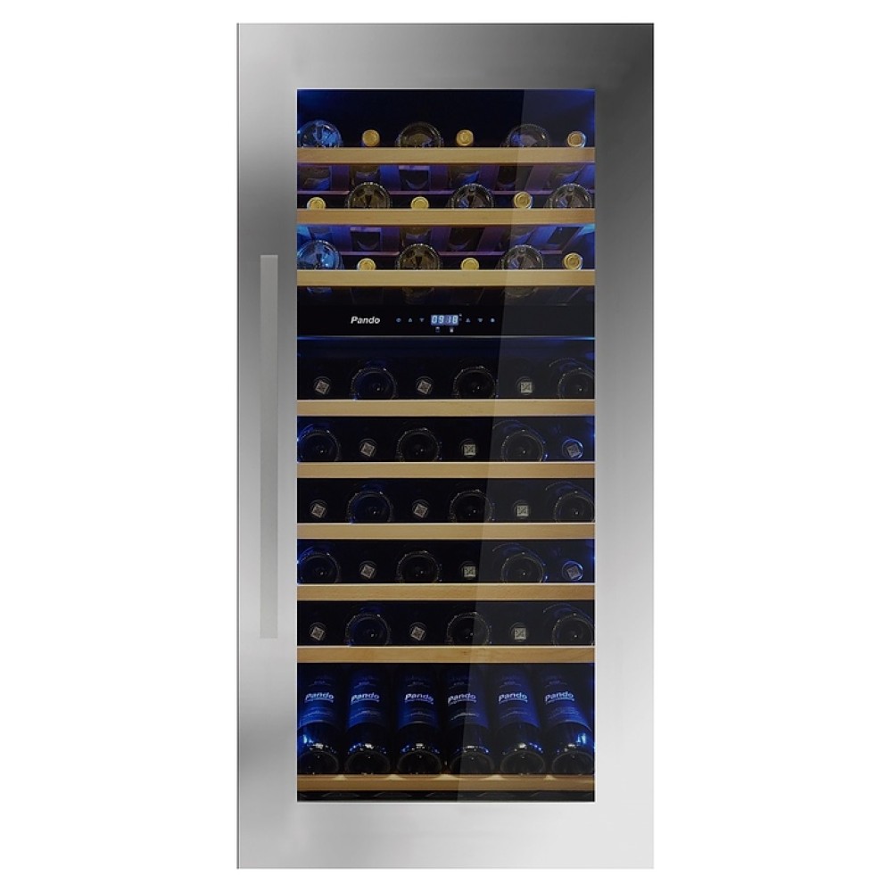 Винный шкаф Pando PVMAV 124-70 XR предназначен для хранения при оптимальных условиях и предпродажной демонстрации бутилированного вина различных сортов в барах, ресторанах, специализированных магазинах, подсобных складских помещениях, а также домашних условиях. Модель оснащена холодильной камерой с 2 температурными зонами, правосторонней распашной дверью, вертикальной рукояткой, внутренней сенсорной панелью управления и светодиодными цифровыми дисплеями с голубой подсветкой индикации. Корпус выполнен из стали с антикоррозийным покрытием черного цвета, фронт рамы двери и рукоятка – из нержавеющей стали с серебристой поверхностью, остекление – из закаленного стекла с прозрачной дымчатой тонировкой, внутренняя облицовка камеры черного цвета, полки – из массива буковой древесины.