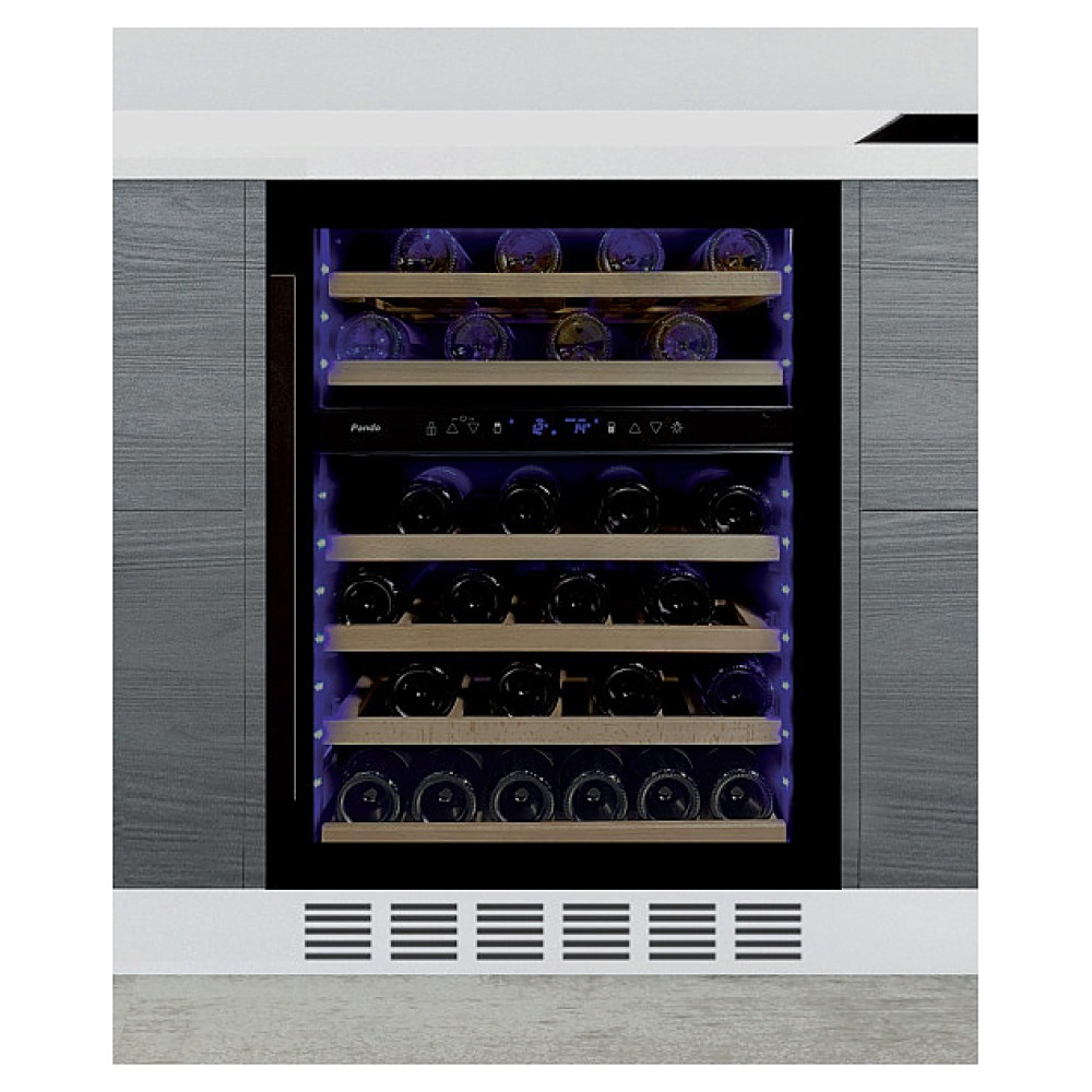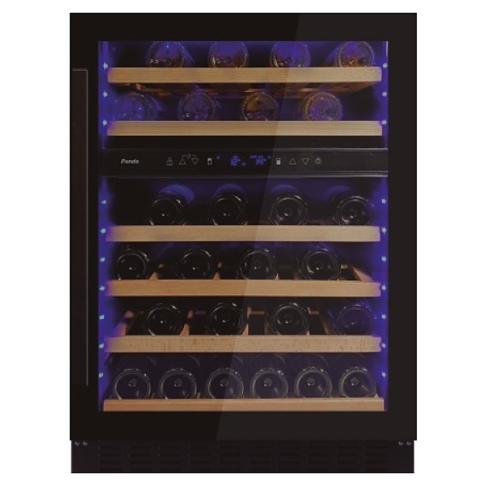 Винный шкаф Pando PVZB 60-46 CRL предназначен для хранения при оптимальных условиях и предпродажной демонстрации бутилированного вина различных сортов в барах, ресторанах, специализированных магазинах, подсобных складских помещениях, а также домашних условиях. Модель оснащена холодильной камерой с 2 температурными зонами, левосторонней распашной дверью, вертикальной рукояткой, внутренней сенсорной панелью управления и светодиодными цифровыми дисплеями с голубой подсветкой индикации. Корпус выполнен из стали с антикоррозийным покрытием черного цвета, дверь с полным фронтальным остеклением без винтового крепежа из закаленного стекла с прозрачной дымчатой тонировкой, рукоятка – из анодированного алюминия с черной поверхностью, внутренняя облицовка камеры черного цвета, полки – из массива буковой древесины.