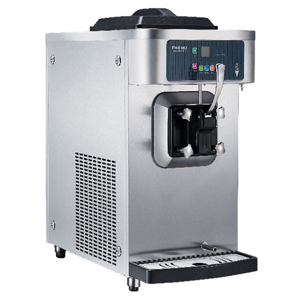 Настольный фризер Pasmo S110F используется на предприятиях общественного питания и торговли для приготовления мягкого мороженого, замороженного йогурта, муссов или сорбетов. Модель оснащена цилиндром с шнеком, бункером, каплесборником, диспенсером с рукояткой, устойчивыми опорами, панелью управления с символьным меню и информативным текстовым дисплеем. Корпус выполнен из нержавеющей стали, шнек - из высококачественной пищевой нержавеющей стали SS304, рукоятка - из хромированного металла.