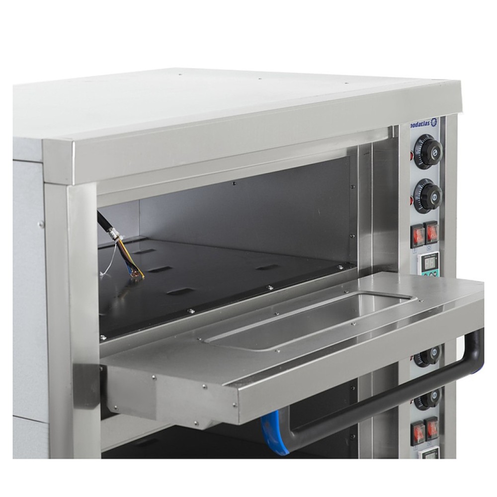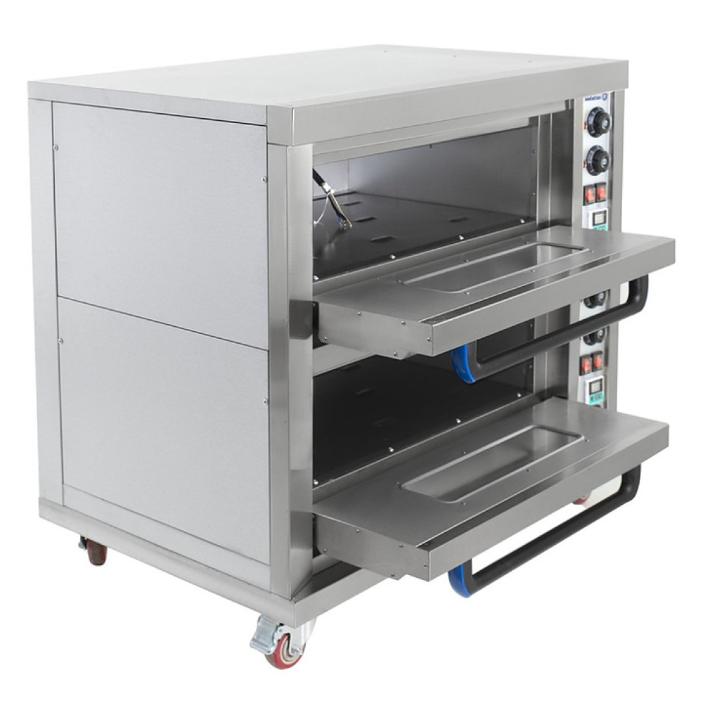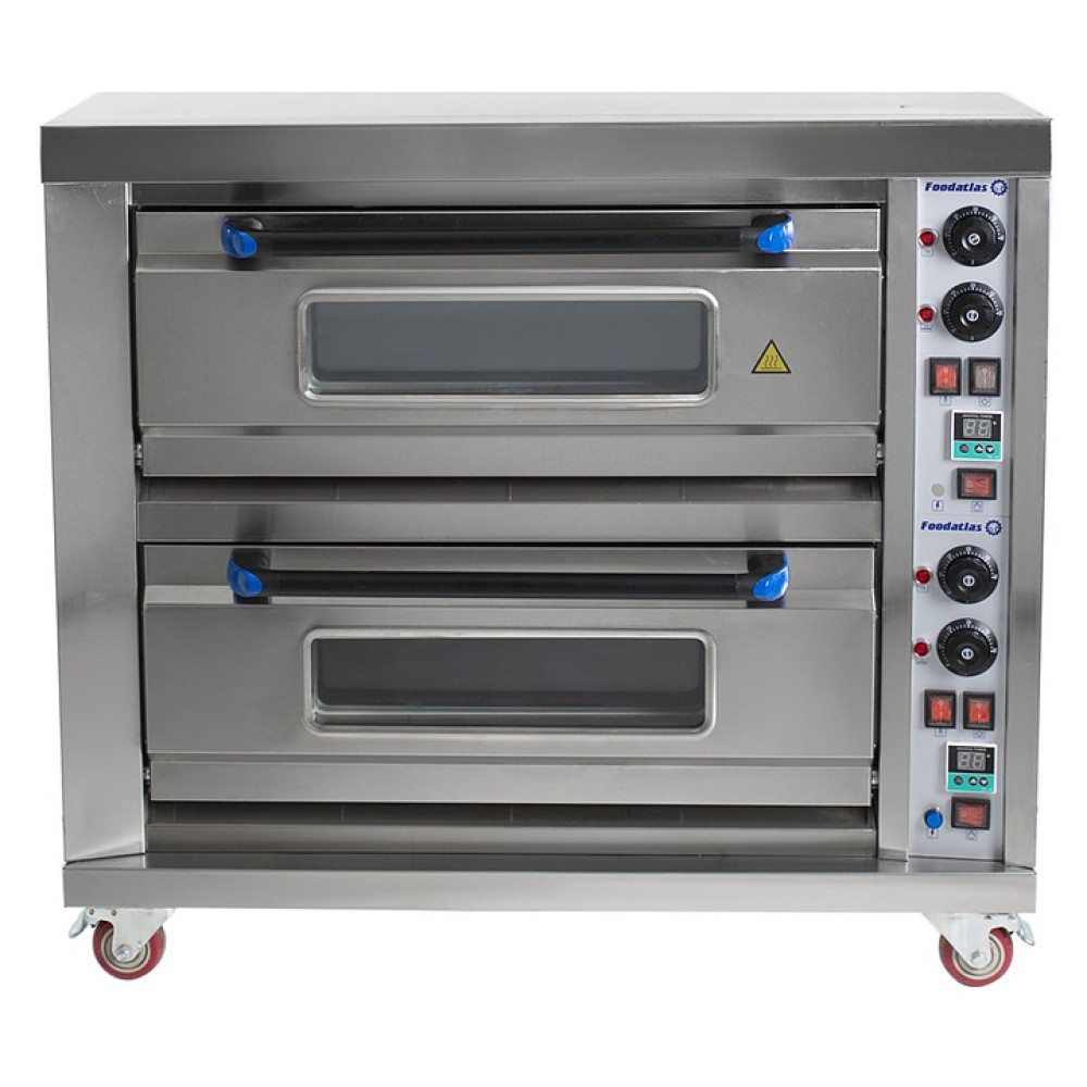 Хлебопекарная печь Foodatlas HEO-22 используется на предприятиях общественного питания и торговли для выпечки широкого ассортимента хлебобулочных и кондитерских изделий: хлеба пшеничного, ржано-пшеничного формового и подового, хлебобулочной продукции, мучных кондитерских изделий, просфор, куличей и приготовления мясных, рыбных, овощных и других блюд. Модель оснащена 2 камерами, электромеханической панелью управления с 4 реле для регулировки температуры, ТЭНами, расположенными внизу и вверху камер, внутренней подсветкой и дверями с ненагревающимися ручками и смотровымы окнами, позволяющим контролировать рабочий процесс. Корпус выполнен из окрашенной стали, передняя панель - из нержавеющей стали и стекла.