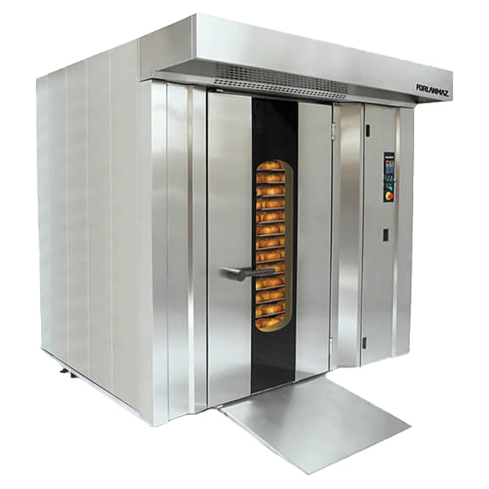 Ротационная газовая печь Porlanmaz Bakery Machinery PMDF 100F применяется на профессиональных кухнях пекарен и кондитерских для выпекания хлеба, булочек, кексов, коржей, бисквитов, печенья, пироженых, круассанов и других изделий из теста. Модель оснащена лампами освещения на дверях кабины печи, которые легко заменяются снаружи. Камера сгорания выполнена из нержавеющей стали с выносливостью больше 1000 градусов тепла.