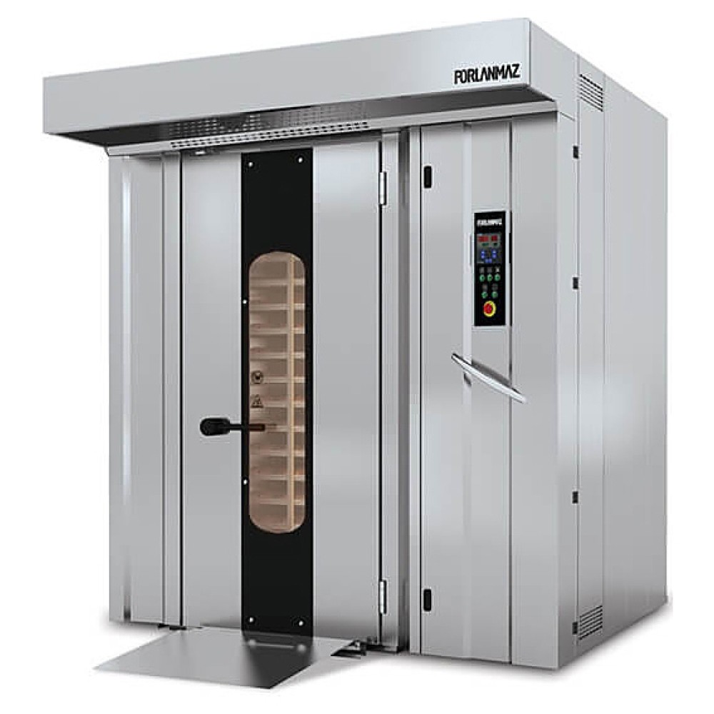 Ротационная газовая печь Porlanmaz Bakery Machinery PMDF 150F применяется на профессиональных кухнях пекарен и кондитерских для выпекания разнообразных хлеба, булочек, кексов, коржей, бисквитов, печенья, пироженых, круассанов и других изделий из теста. Модель оснащена лампами освещения на дверях кабины печи, которые легко заменяются снаружи. Камера сгорания выполнена из нержавеющей стали SUS 304 с выносливостью больше 1000 градусов тепла.