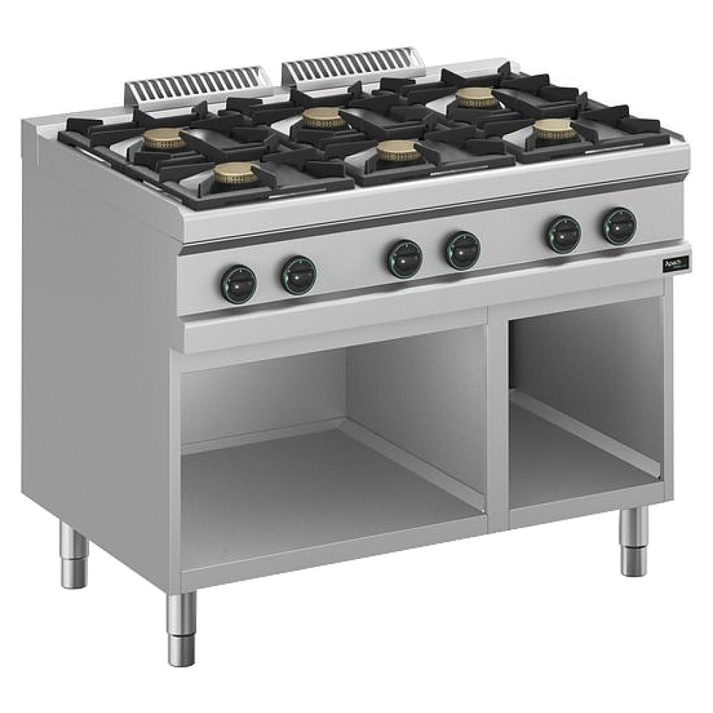 Газовая плита Apach APRG-117P/PL 700-й серии предназначена для приготовления различных блюд из мяса, птицы, рыбы и овощей в наплитной посуде на предприятиях общественного питания и торговли. Модель оснащена электромеханической панелью управления, гидроизолированной прессованной поверхностью и открытой подставкой с регулируемыми по высоте ножками. Корпус, рабочая поверхность и панель управления выполнены из нержавеющей стали, решетки - из чугуна.