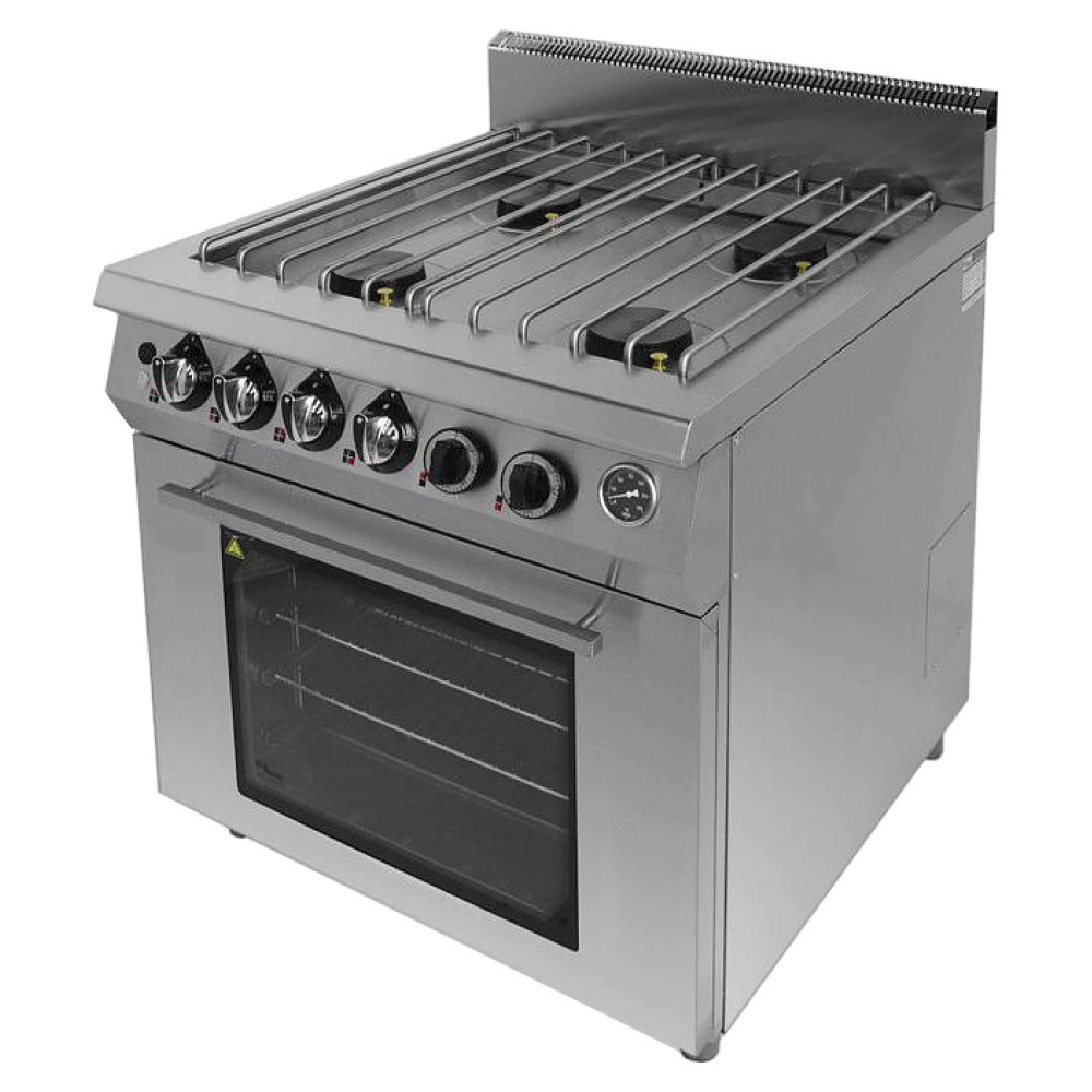 Газовая плита KAYMAN ПГ-4-13/900 предназначена для приготовления первых, вторых и третьих блюд в наплитной посуде на предприятиях общественного питания и торговли. Модель оснащена 4 горелками класса Heavy Duty с решеткой, запальным розжигом, системой "газ-контроль" и духовым шкафом. Все корпусные элементы выполнены из пищевой нержавеющей стали, дверца духового шкафа - из стекла.