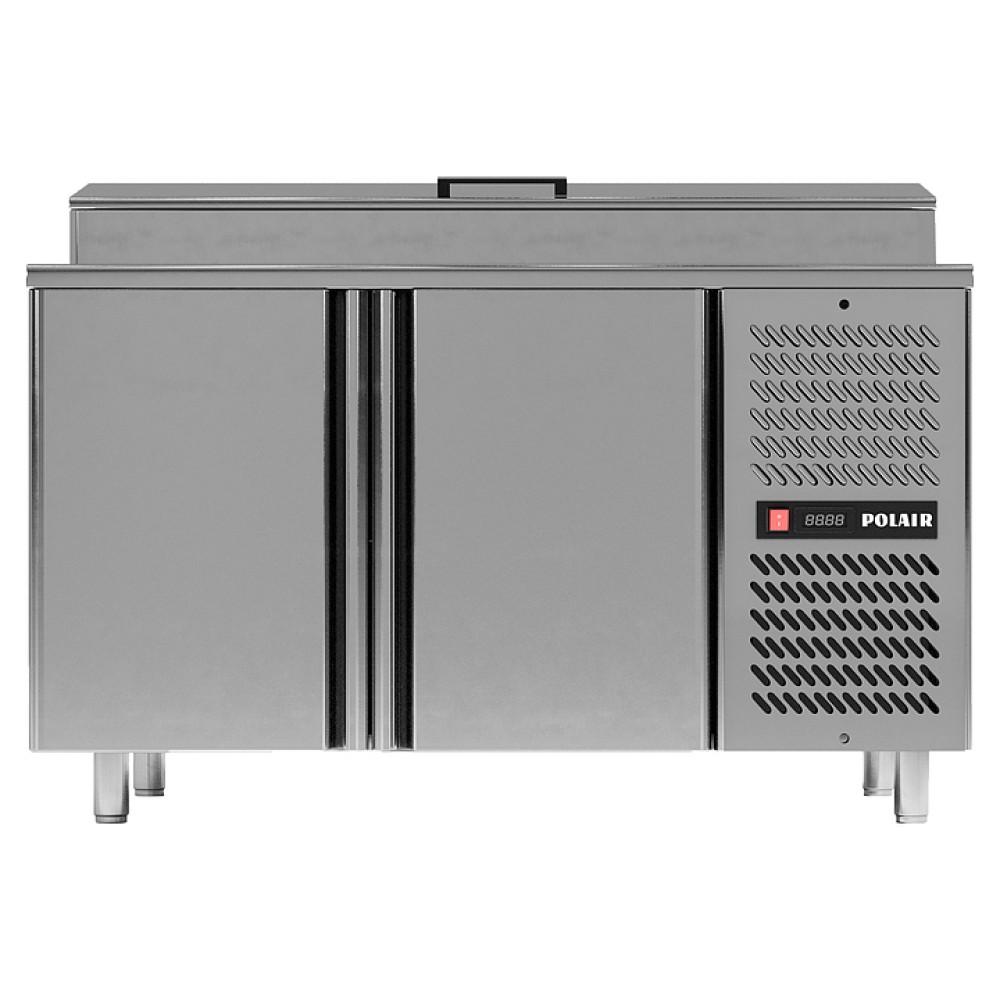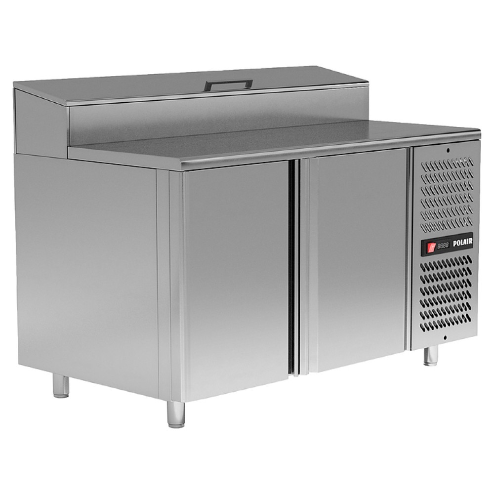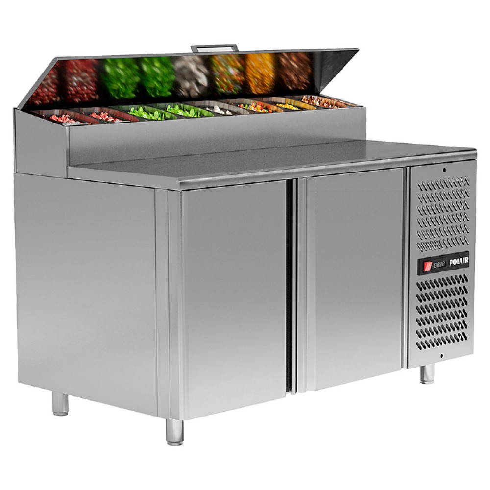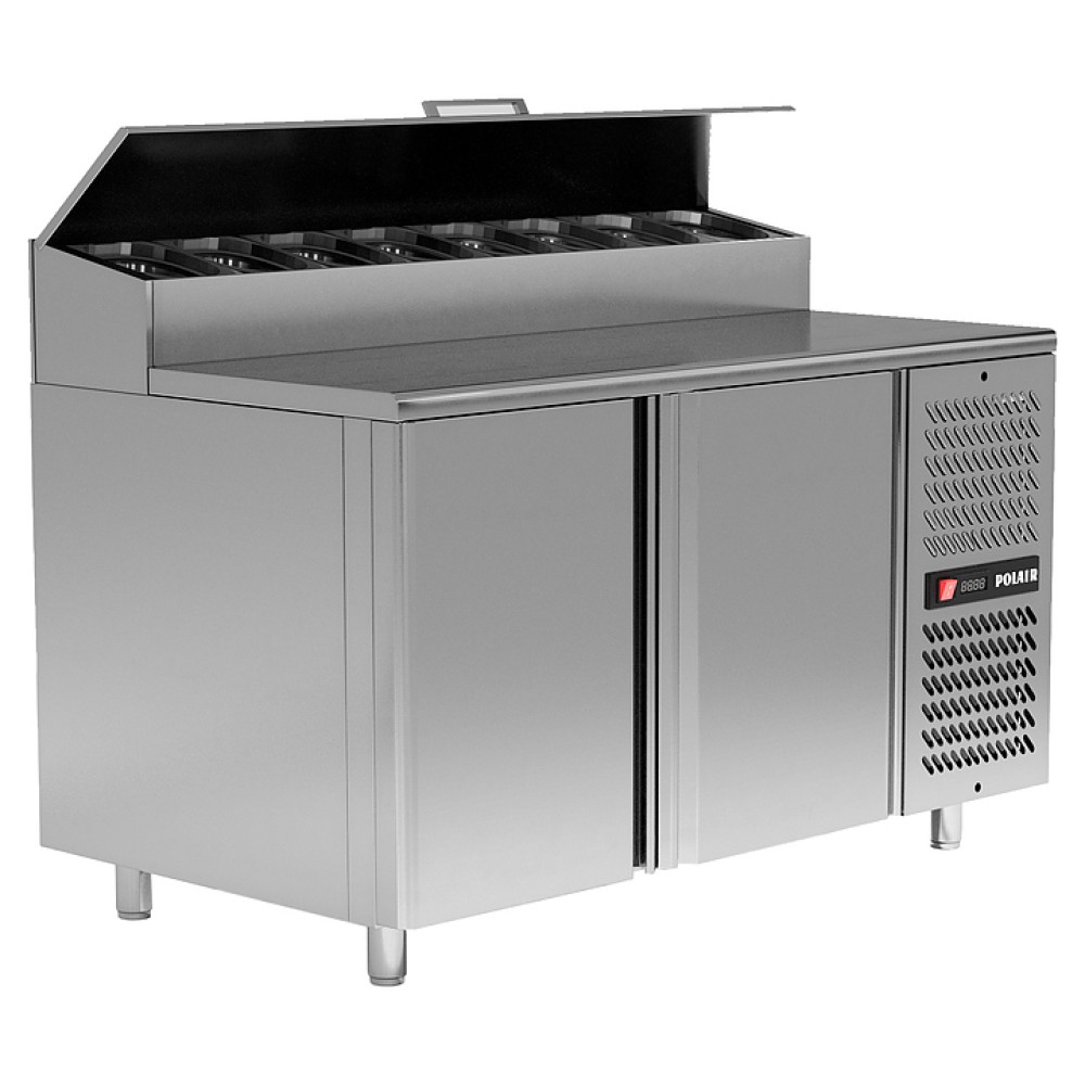 Холодильный стол POLAIR TM2GNVT-G предназначен для хранения продуктов и обработки ингредиентов в пиццерии и ресторане итальянской кухни. Модель оснащена интегрированной витриной и крышкой, которая в режиме работы фиксируется в открытом положении для удобства персонала. Обшивка корпуса и столешница выполнены из нержавеющей стали, термоизоляция корпуса и витрины - из пенополиуретана.