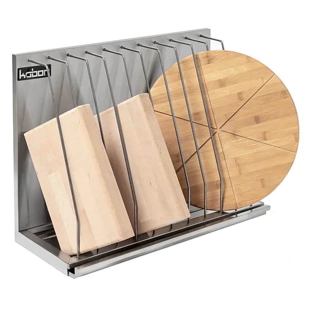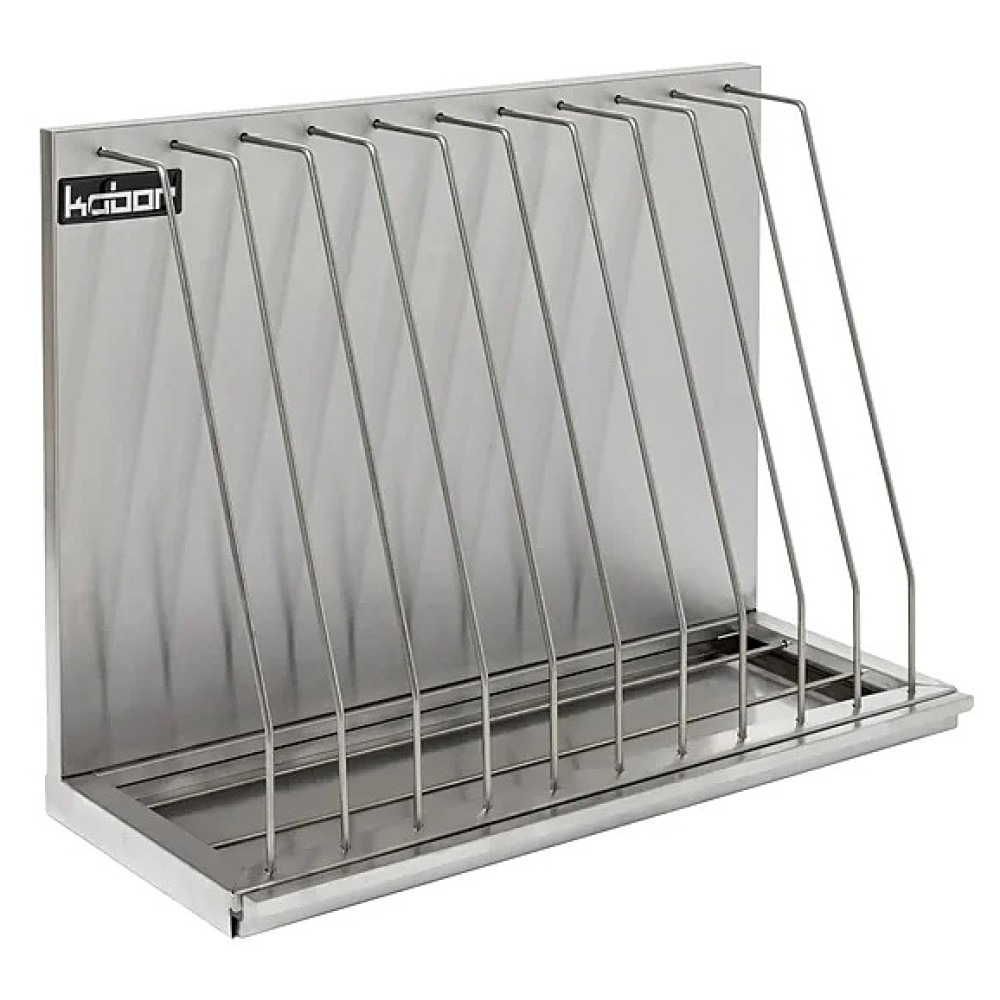 Настенная полка Кобор ПКД-30/25 состоит из широких ячеек, что помогает разместить 4 доски разной толщины. Внизу полки находится специальный поддон для сбора воды.