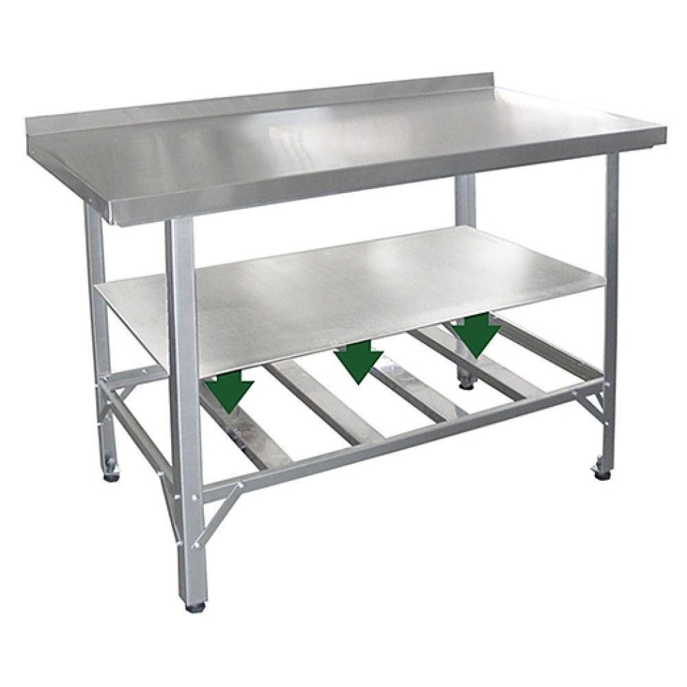 Сплошная полка ПищТех НК-СРО, СРО(б) используется совместно с производственными столами 1000х600 мм для хранения кухонного инвентаря и посуды. Полка устанавливается поверх полки-решетки. Изделие выполнено из нержавеющей стали.