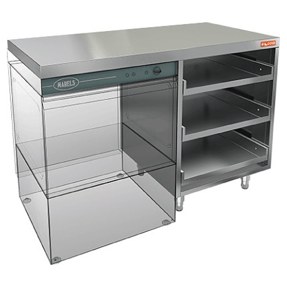 Стол HICOLD НБМКБКП-12/5Л предназначен для комплектации модульных барных стоек на предприятиях общественного питания и торговли. Модель оснащена открытым отделением с 3 полками для хранения корзин с бокалами, устойчивыми опорами и столешницей с расположенным с левой стороны крылом для установки под него посудомоечной машины. Корпус и столешница выполнены из высококачественной нержавеющей стали AISI 430, столешница усилена листом древесно-стружечной плиты (ДСП). Изделие поставляется в сборе.