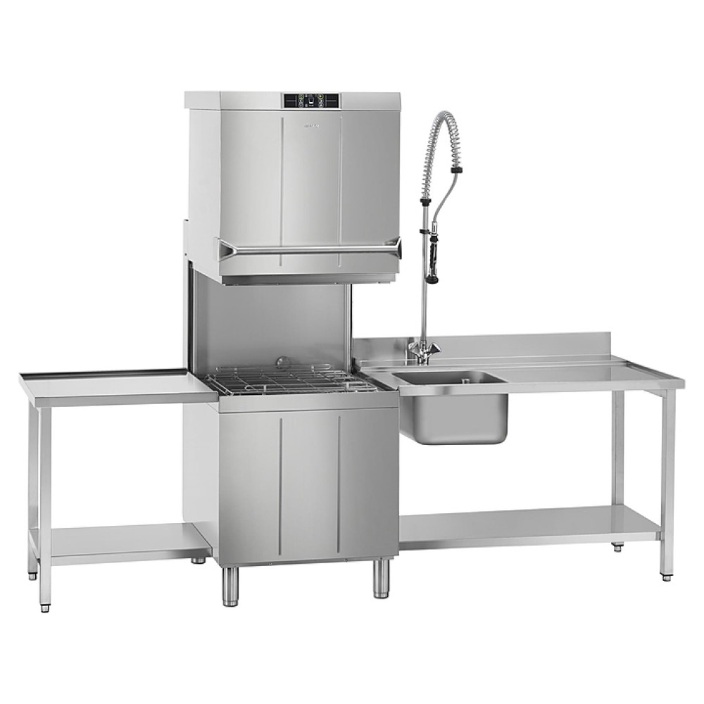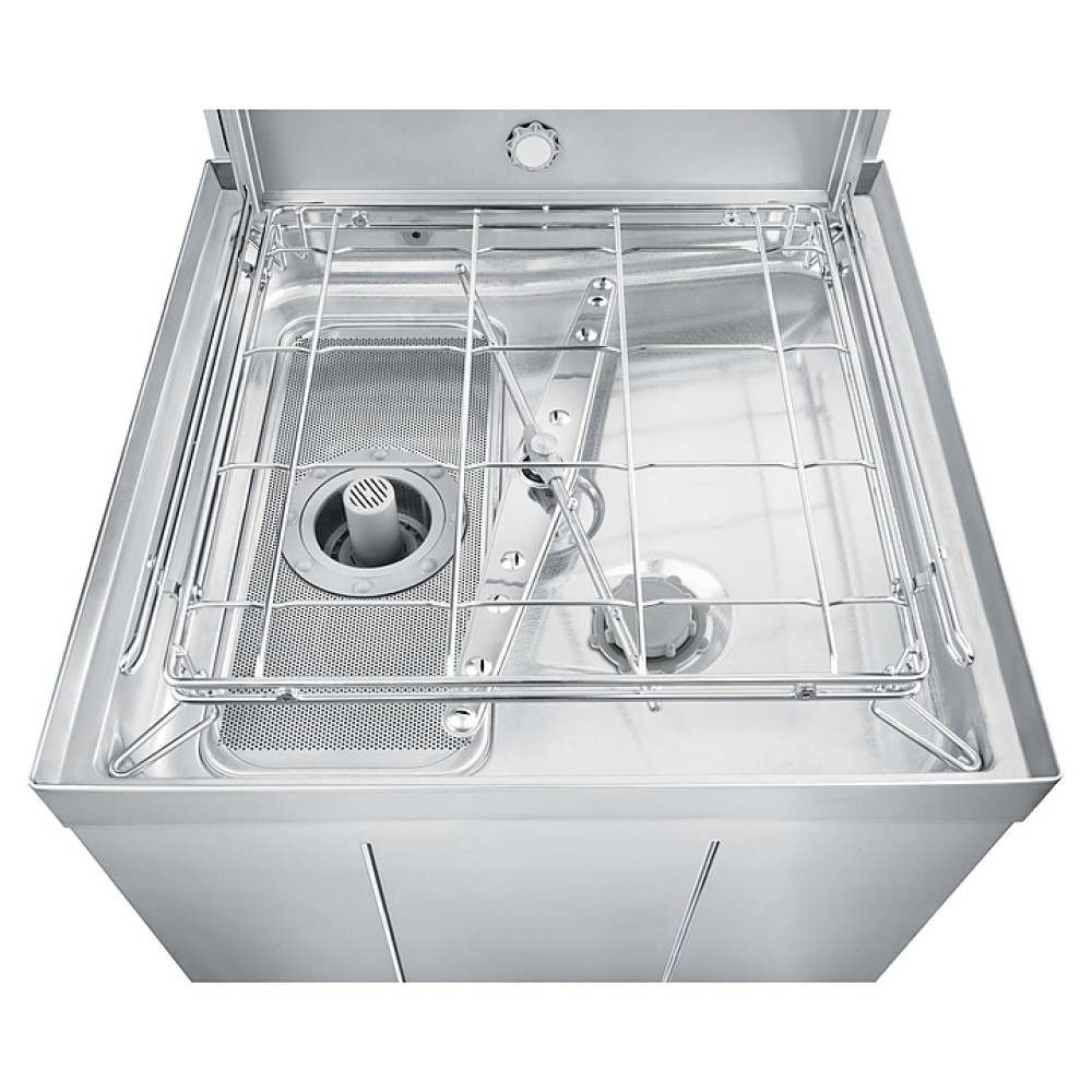 Купольная посудомоечная машина Smeg HTY625DEH серии TopLine используется на предприятиях общественного питания и торговли для мойки столовых приборов, тарелок, стаканов, чашек и другой посуды. Модель оснащена электронной панелью управления. Корпус, моющие и ополаскивающие рукава выполнены из нержавеющей стали AISI 304.
