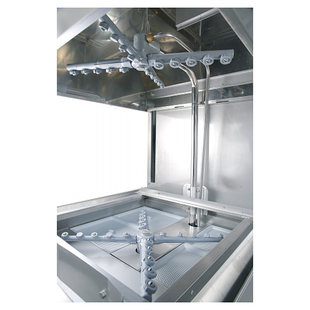 Посудомоечная машина Hi Chief DW-1000+DR+DET+RA ECO предназначена для мытья в кассетах различной посуды, стаканов, чашек и столовых приборов с применением жидких моющих и ополаскивающих средств на предприятиях общественного питания и торговли. Модель оснащена вертикальным подъемным куполом с горизонтальной рукояткой, бойлером, электродвигателем, верхними и нижними моечными рукавами, насосом-дозатором моющего и ополаскивающего средства, дренажным насосом, кабелем питания с вилкой, электромеханической панелью управления с поворотным переключателем и клавишей слива. Корпус и внутренняя облицовка камеры выполнены из нержавеющей стали, моечные рукава – из высококачественного термостойкого пластика.