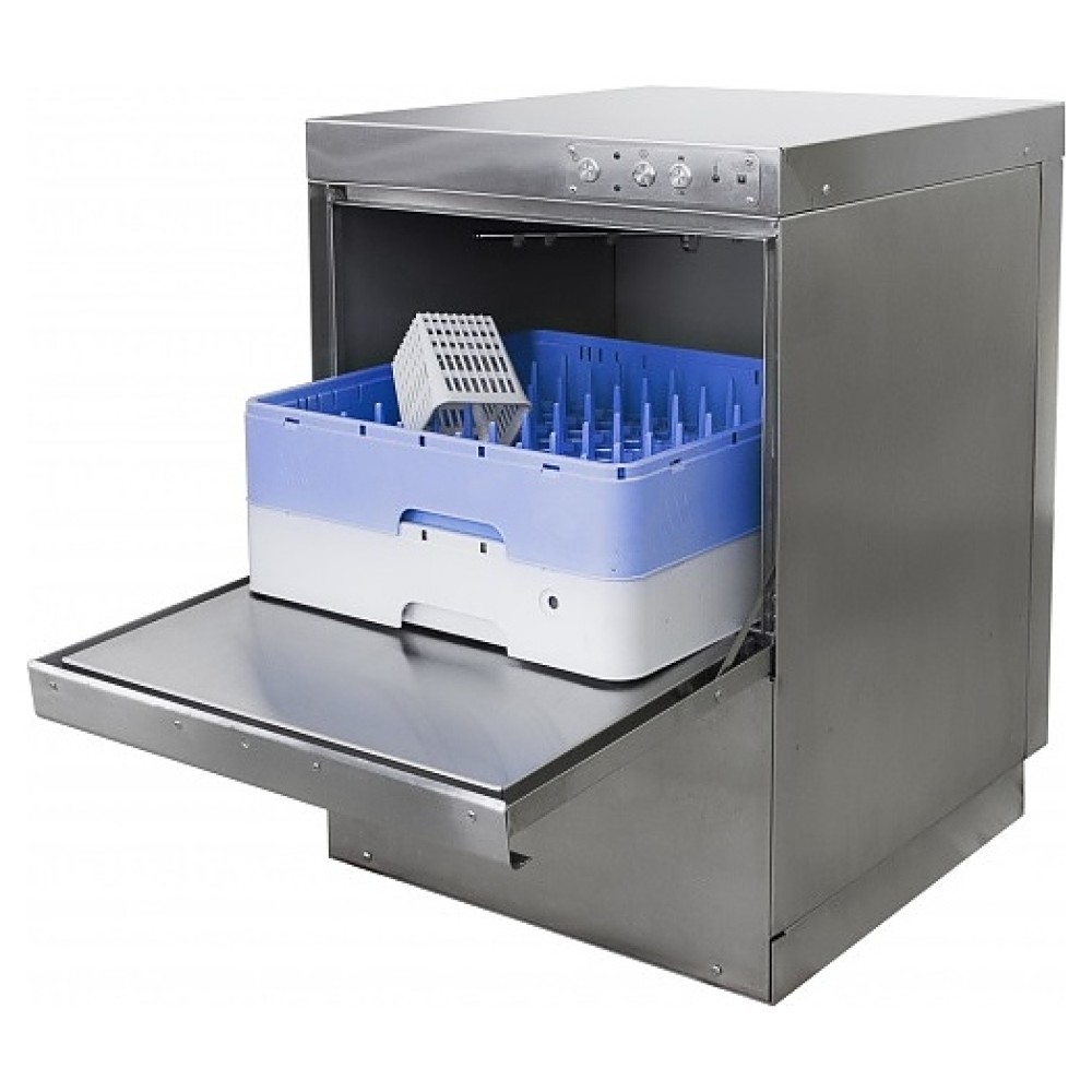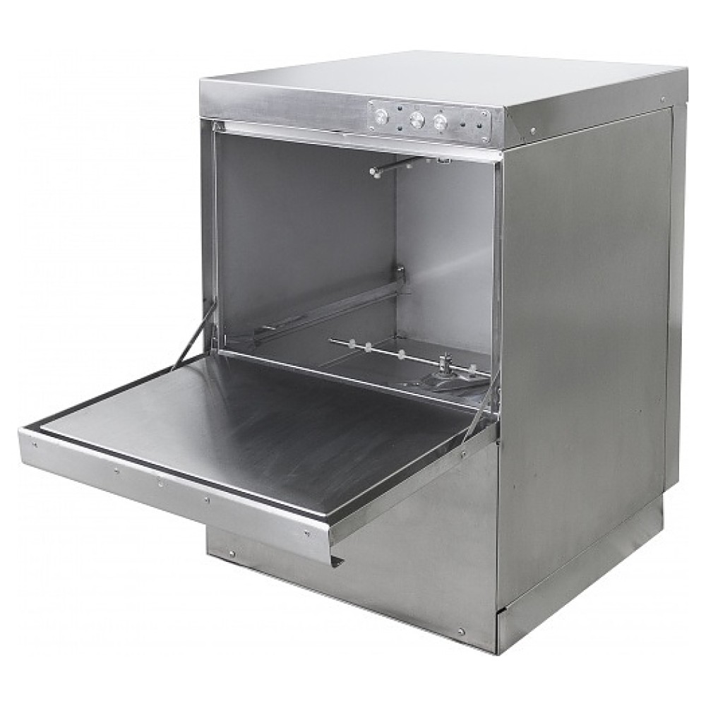 Посудомоечная машина Пищевые Технологии МП-500Ф предназначена для мытья в кассетах различной столовой посуды с применением жидких моющих и ополаскивающих средств на предприятиях общественного питания и торговли. Модель оснащена фронтальной камерой с моечной ванной, бойлером, электронасосом, насосом-дозатором ополаскивающего средства, верхними и нижними моечными рукавами, откидной дверью с горизонтальной рукояткой и кнопочной панелью управления. Камера, дверь и основные детали разбрызгивателей выполнены из нержавеющей стали AISI 304, корпус - из нержавеющей стали AISI 201.