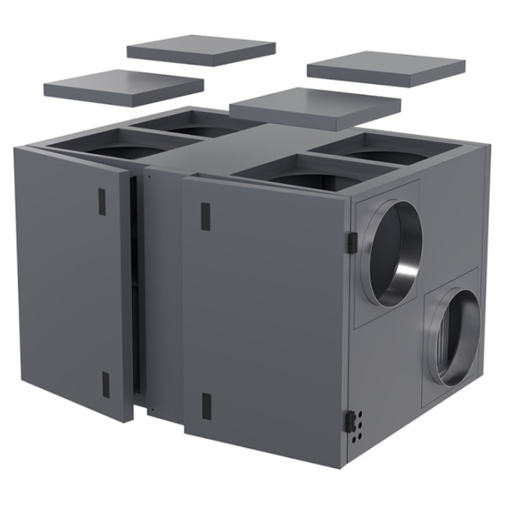 Приточно-вытяжная вентиляционная установка COMPACTAIR ZPVR-N 2000 UER ЕС серии ZPVR-N U EC предназначена для организации приточно-вытяжной вентиляции в коммерческих, административных, хозяйственных или жилых помещениях. Модель оснащена системой приточного и вытяжного вентиляторов, теплообменником, системой фильтров и встроенной автоматикой, пульт – сенсорной клавиатурой и информативным жидкокристаллическим дисплеем индикации. Корпус прибора выполнен из листовой стали с внешним антикоррозийным покрытием порошковой краской оттенка графит (RAL 7024), корпус пульта прямоугольной формы – из белого пластика, изоляция корпуса – из минеральной ваты.